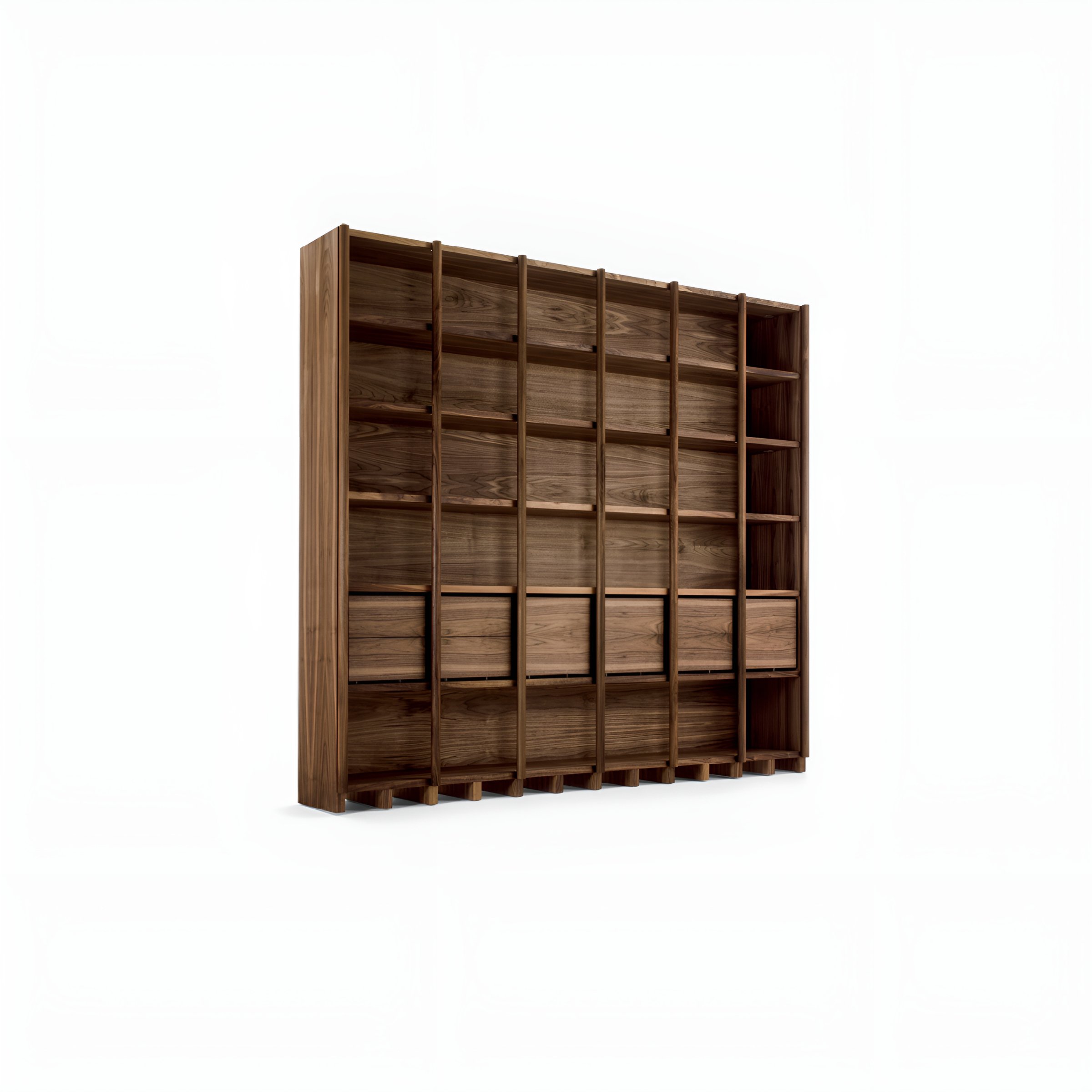 Третья полка, более выступающая, чем другие, подходит для использования в качестве столешницы / письменного стола. Возможность использования в качестве разделительного элемента в окружающей среде. По запросу библиотека может быть изготовлена с полками и распорками из шпонированного многослойного дерева (Bookshelf 2019).