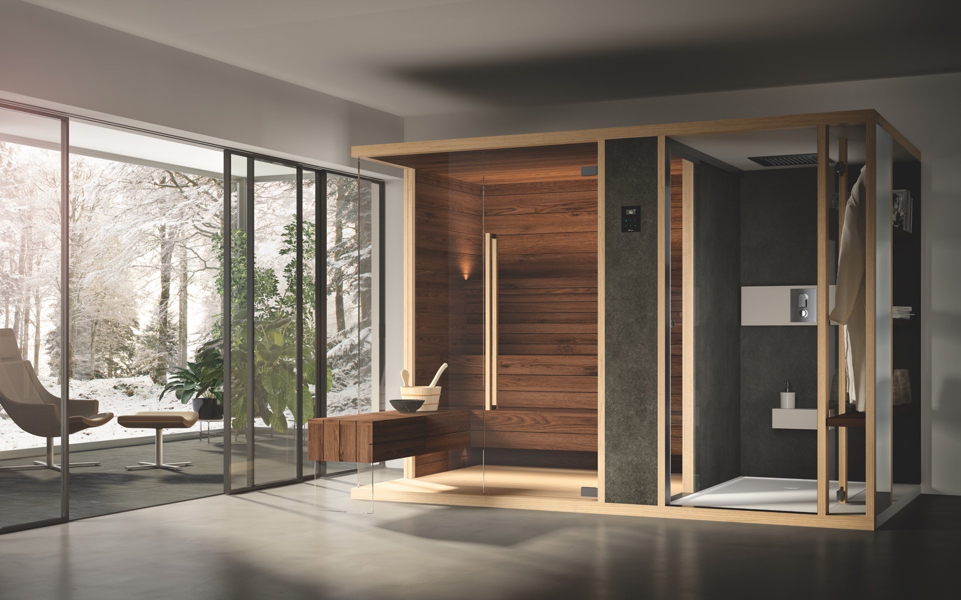 Сочетание функций, улучшающих самочувствие: сауна + душ + оборудованное пространство со скамейкой для отдыха после сауны. Интегрированные элементы мебели с основным дизайном дополняют недавно разработанные интеллектуальные объемы.
