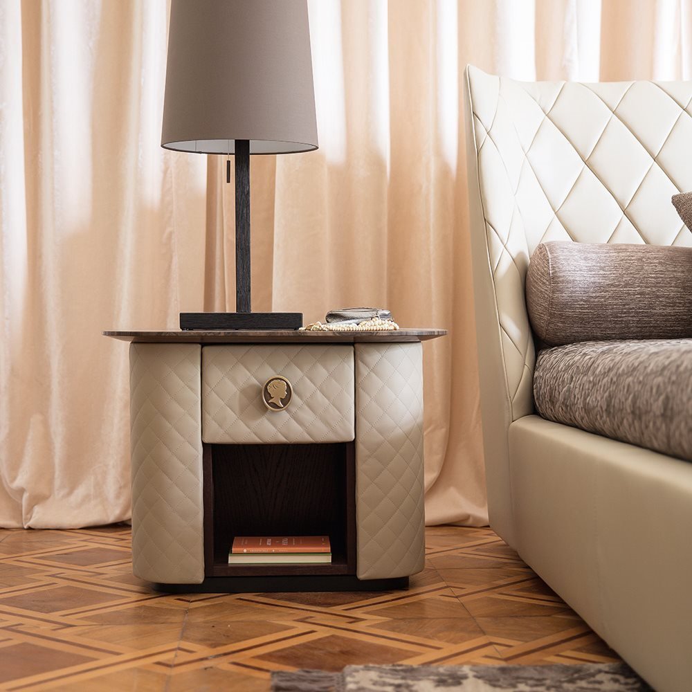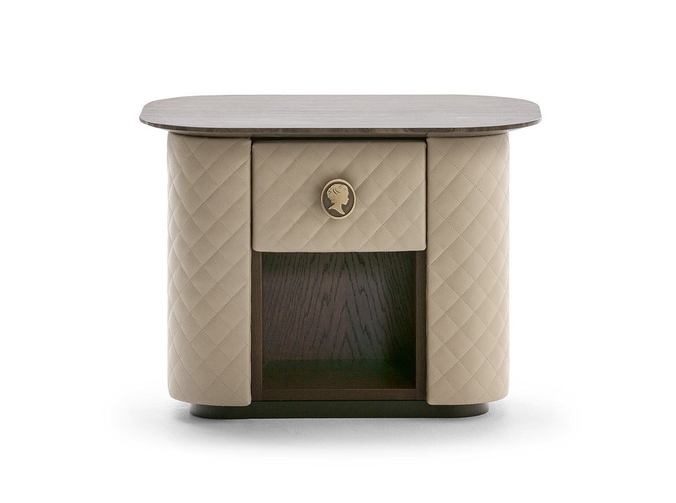 Ящики и шкафы, изготовленные с использованием деталей высокого класса, сочетают в себе лучшую кожу с благородной отделкой и блестящим металлом. Конструкция, дверцы и ящики обтянуты кожей, украшенной ромбами, что придает всему ассортименту элегантный стиль, характерный для итальянской кожаной мебели от-кутюр.