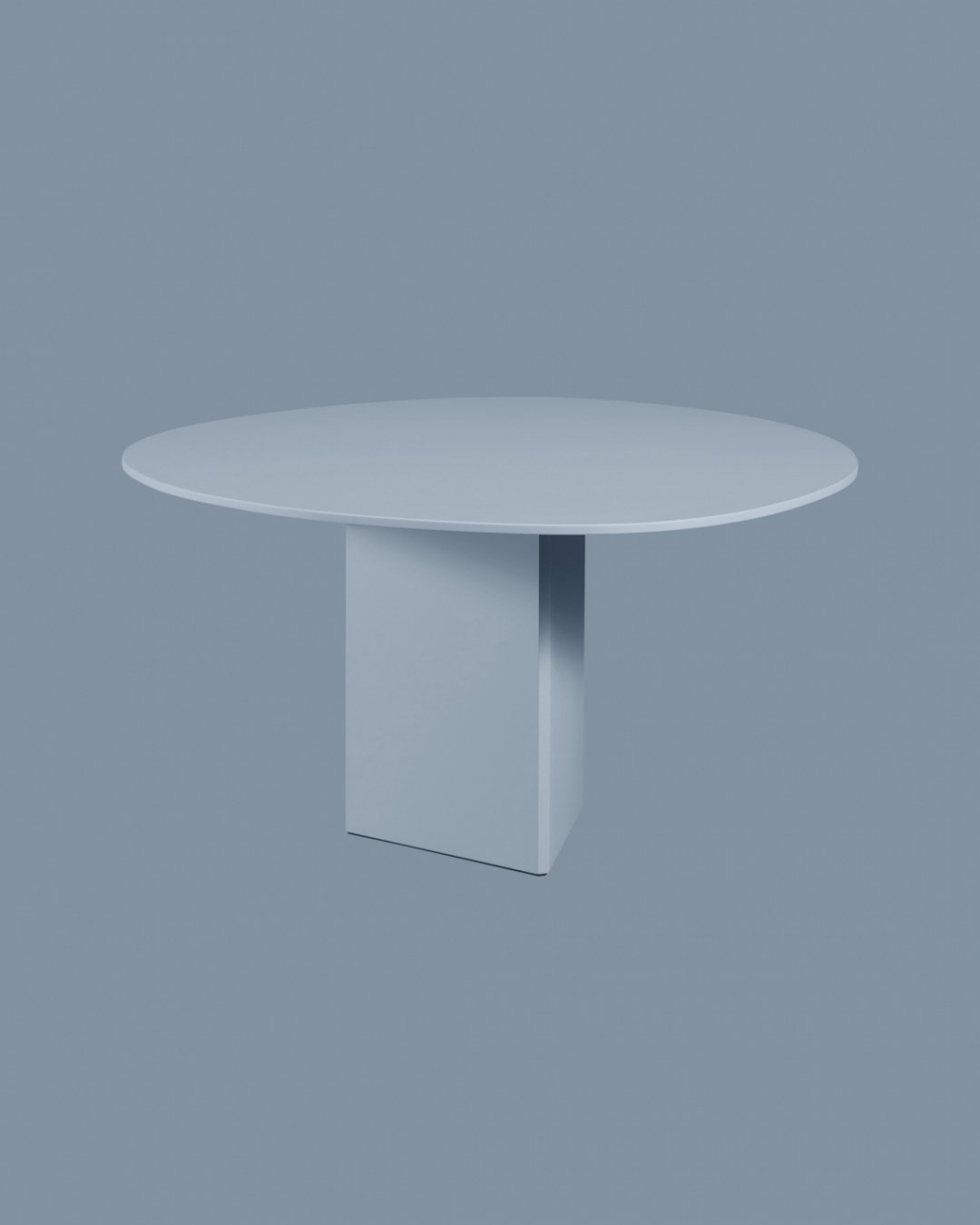 Верхняя часть стола имеет неправильную округлую форму со всех сторон и опирается на гладкое гранёное треугольное основание. Мягкость органичной верхней части сочетается с твёрдостью основания, гармонично объединённых в единое скульптурное целое. Доступны варианты отделки из травертина, дерева или лака, в виде обеденного стола или журнального столика меньшего размера, который при необходимости можно сделать модульным.
