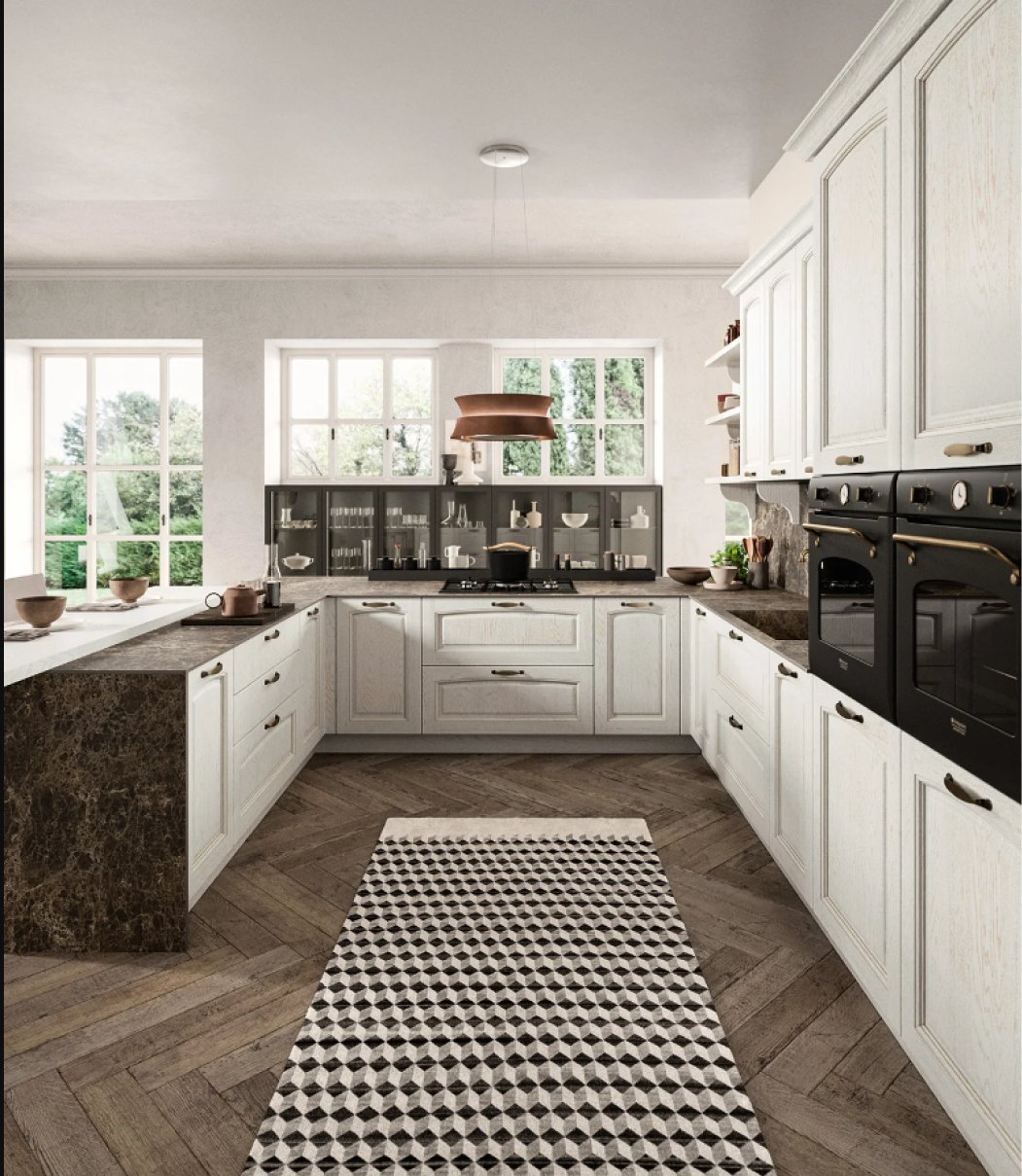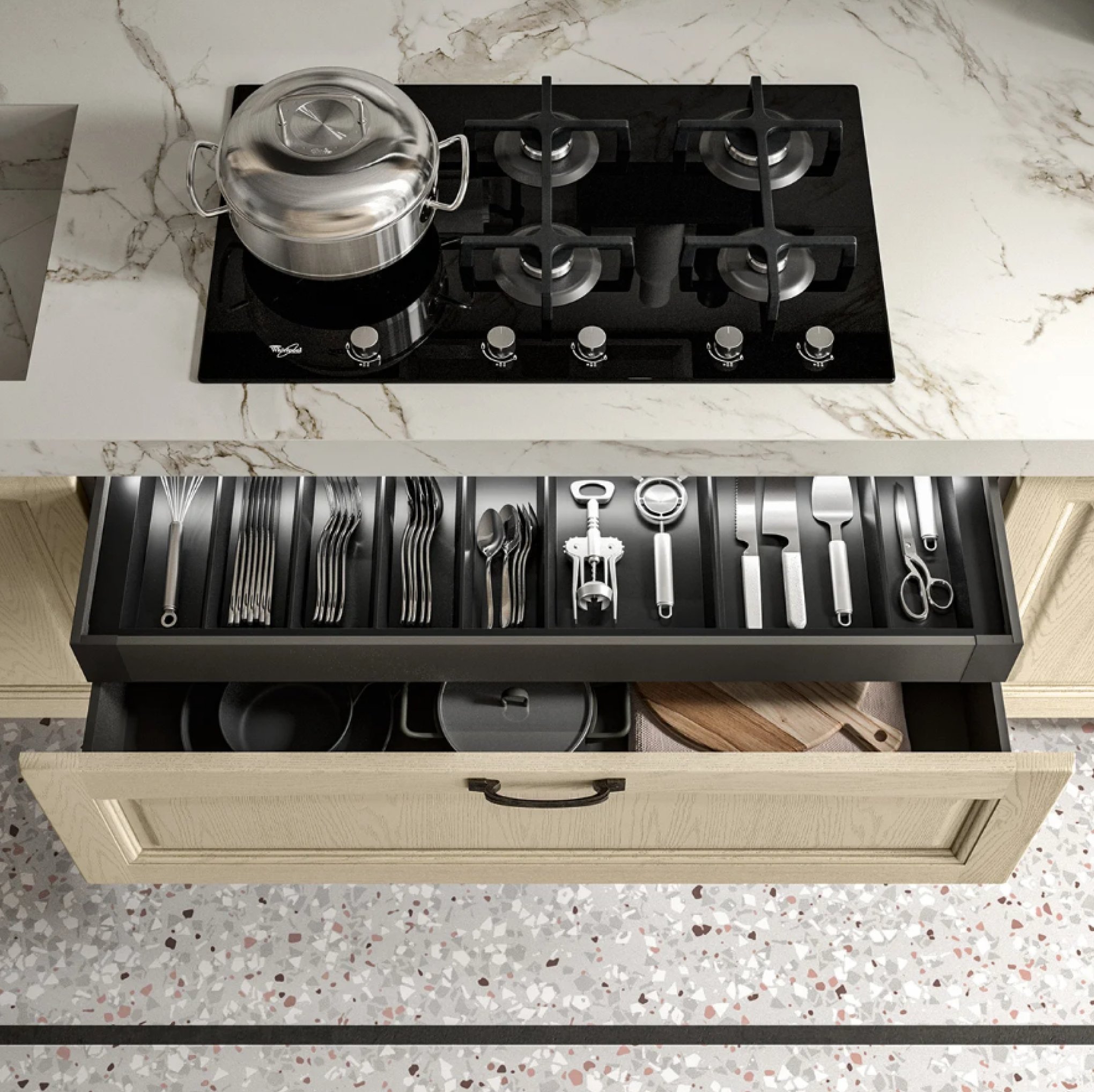 Кухня Emma от Arredo3 отличается классической изысканностью и балансом между стилем и практичностью. Дверца в раме из лакированного цельного ясеня также доступна со стеклянной вставкой с орнаментом, которая дополняет композицию и отражает свет. Кухня Emma, излучающая нестареющую привлекательность традиций, предназначена для помещений, наполненных надежными функциональными аксессуарами и практичными современными решениями, которые удовлетворят все требования современных домовладельцев. Emma - синоним классической изысканности и надежных практичных решений.