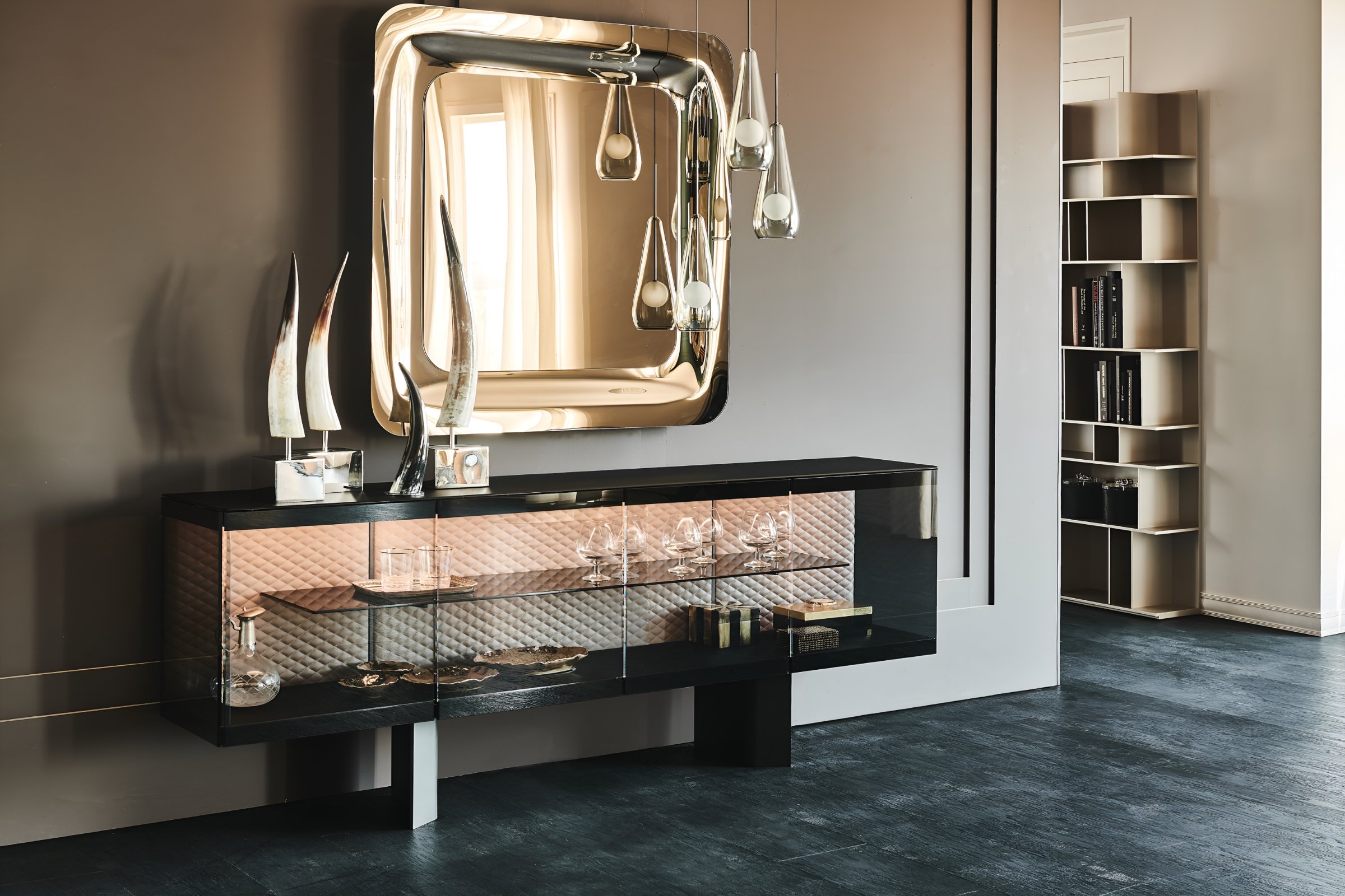 Внутренние стеклянные полки, мягкая обивка спинки и светодиодные лампы — все эти детали призваны подчеркнуть ценность предметов, которые хранятся в этом дизайнерском шкафу, украшающем гостиную с изысканным вкусом. Коллекция современных буфетов Boutique состоит из двух вариантов с 4 дверцами разной высоты и более высокого буфета Boutique Alta с 3 полками.