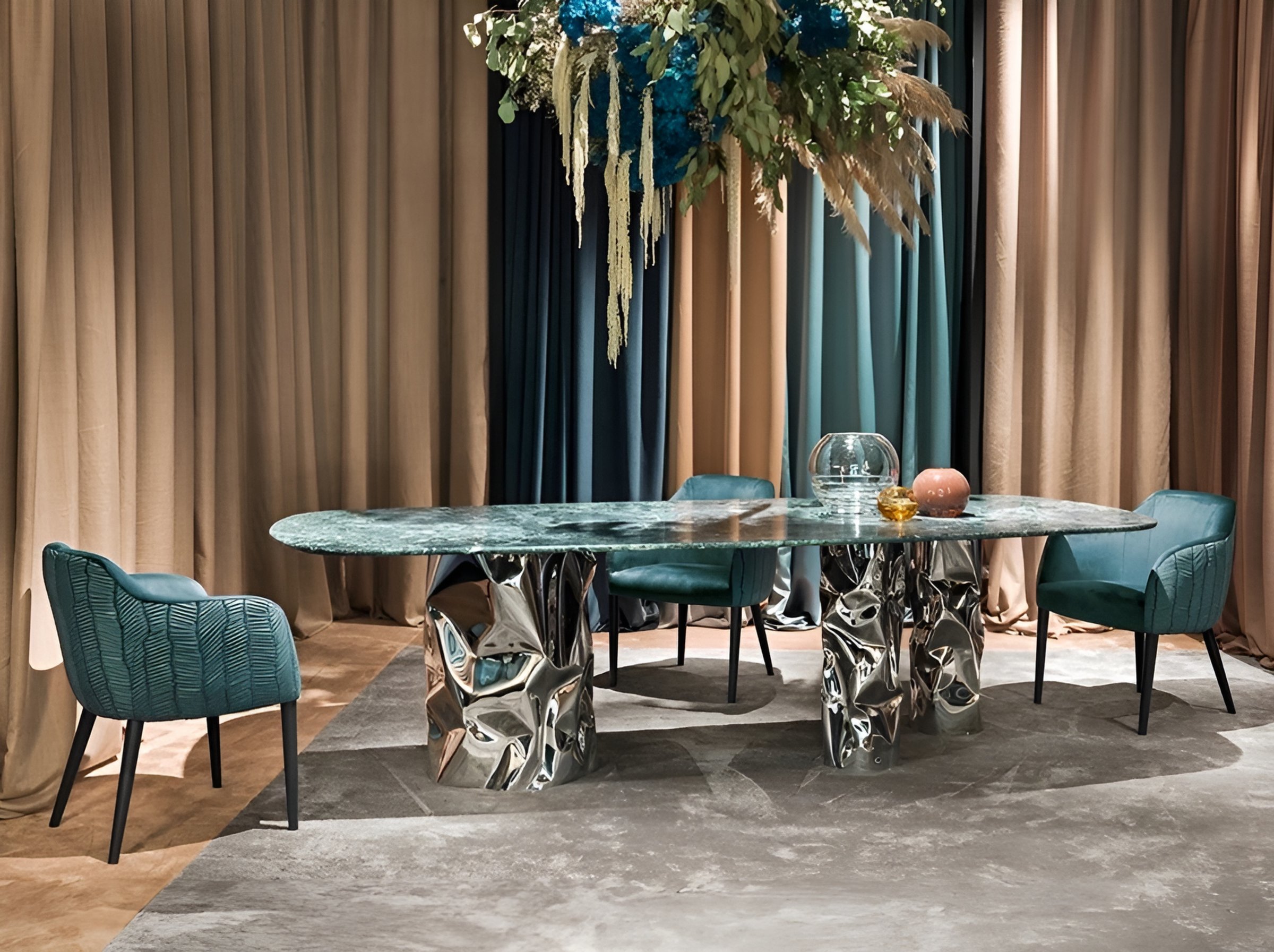 При естественном освещении основания отражают свет, напоминая движение воды. Доступны с мраморной столешницей любого вида и с индивидуальными размерами.