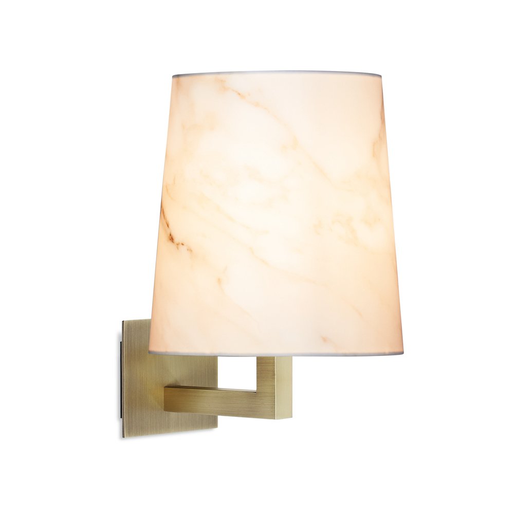 Несмотря на то, что конструкция не изменилась, круглое основание отличается простыми, но современными формами и линиями. Абажуры предлагаются из белого хлопка или белой ткани с принтом под мрамор Calacatta, а при желании изделие можно дополнить цветной отделкой.