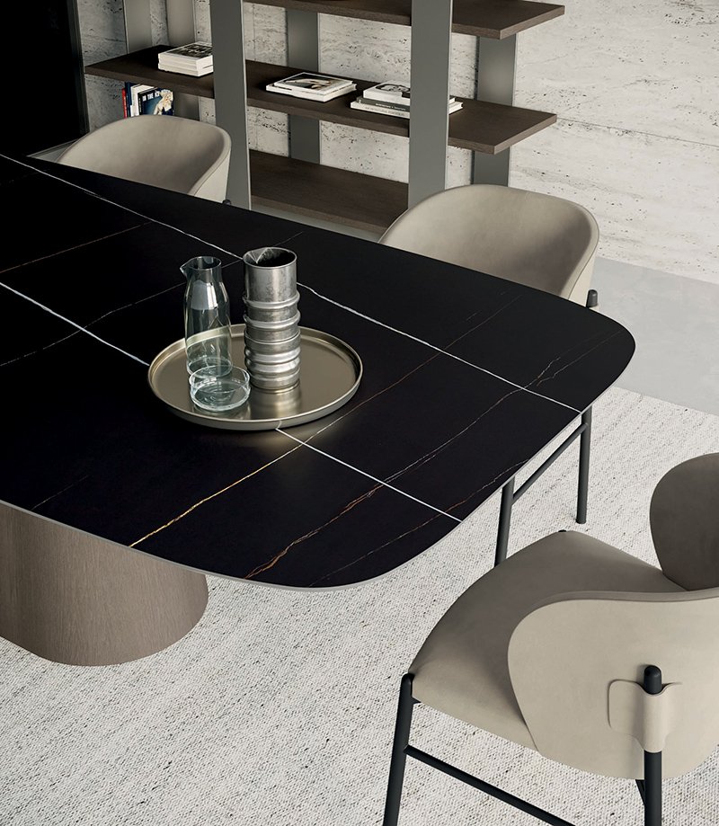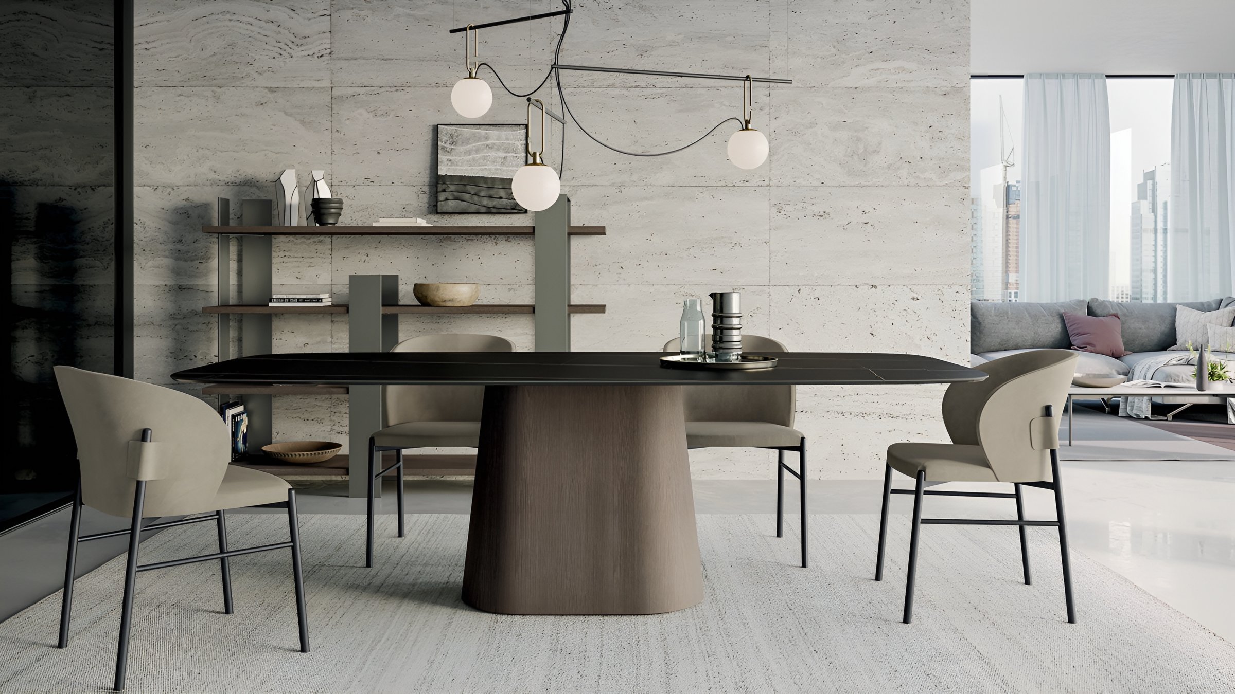 Koniko — это стол с центральным деревянным основанием, который доступен в различных вариантах отделки: от шпона, подчёркивающего натуральный материал, до лакированных поверхностей в широкой цветовой гамме матовых, цементных или металлических оттенков.