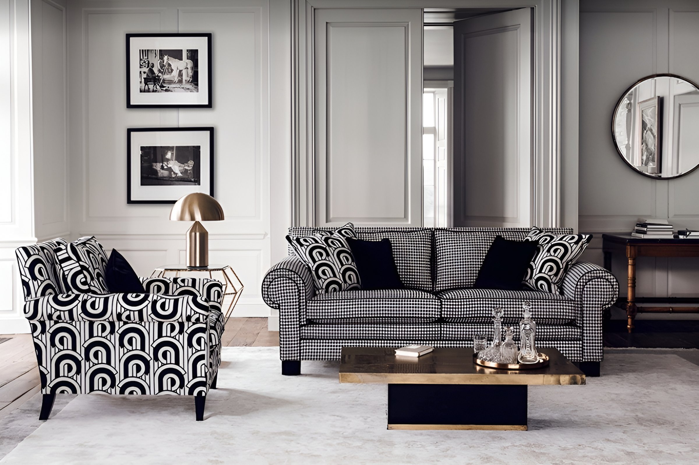 Большой диван Coco представлен в цвете Allure Noir, с контрастной окантовкой в цвете Harrow Black, с двумя большими вставками в цвете Solitaire Noir и двумя маленькими вставками в цвете Harrow Black. Кресло Gabrielle представлено в цвете Solitaire Noir, с контрастной окантовкой в цвете Harrow Black, все деревянные ножки в цвете Ebony.