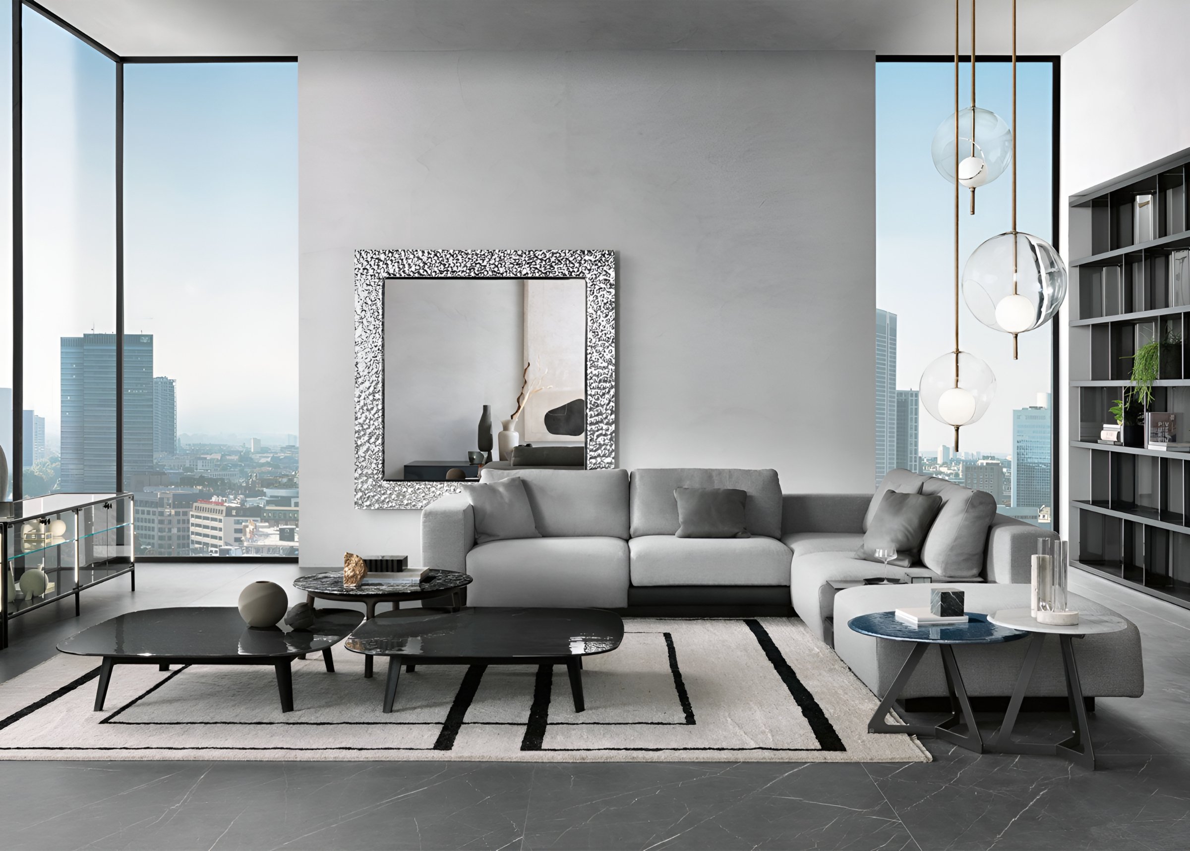 Пружинный блок сиденья с эластичными ремнями. Наполнитель сиденья из полиуретана плотностью 35 кг/м3 и эффектом памяти; наполнитель спинки из гусиного и утиного пуха, моющийся и стерилизуемый. Конструкция приподнята над полом за счет линейных элементов из черного многослойного материала. Диван может быть обит кожей или тканью. Декоративная окантовка основания и элемент «поддон» обтянуты шелковистой кожей.