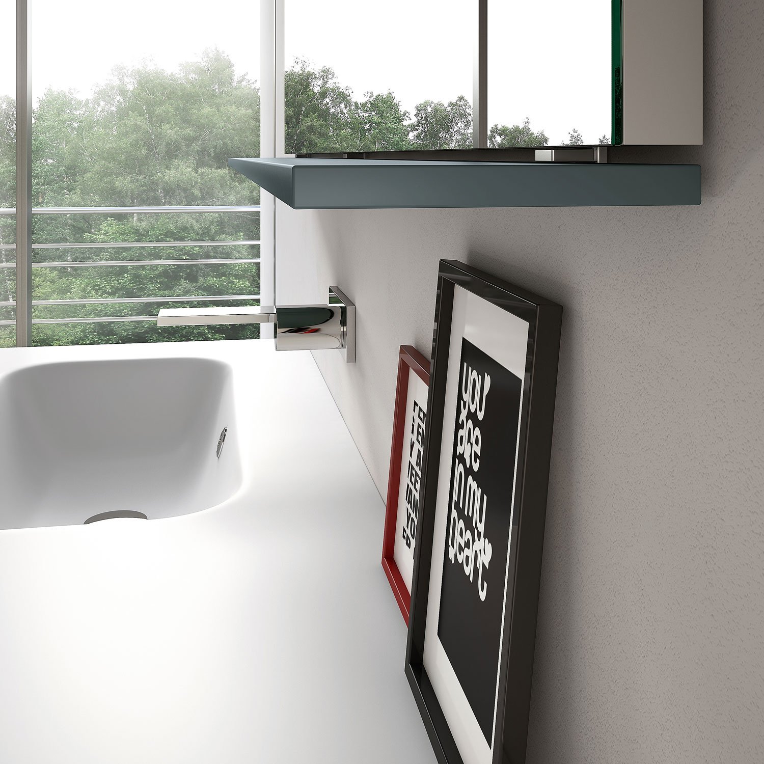 Дополняется хрустальными полками (sp. 1, глубина 12 см) или в отделке (СП. 1,2 см, глубина 12 см) с алюминиевыми опорами, полированным хромом или черным, которые можно прикрепить непосредственно к туалетному столику (без отверстий в стенах).