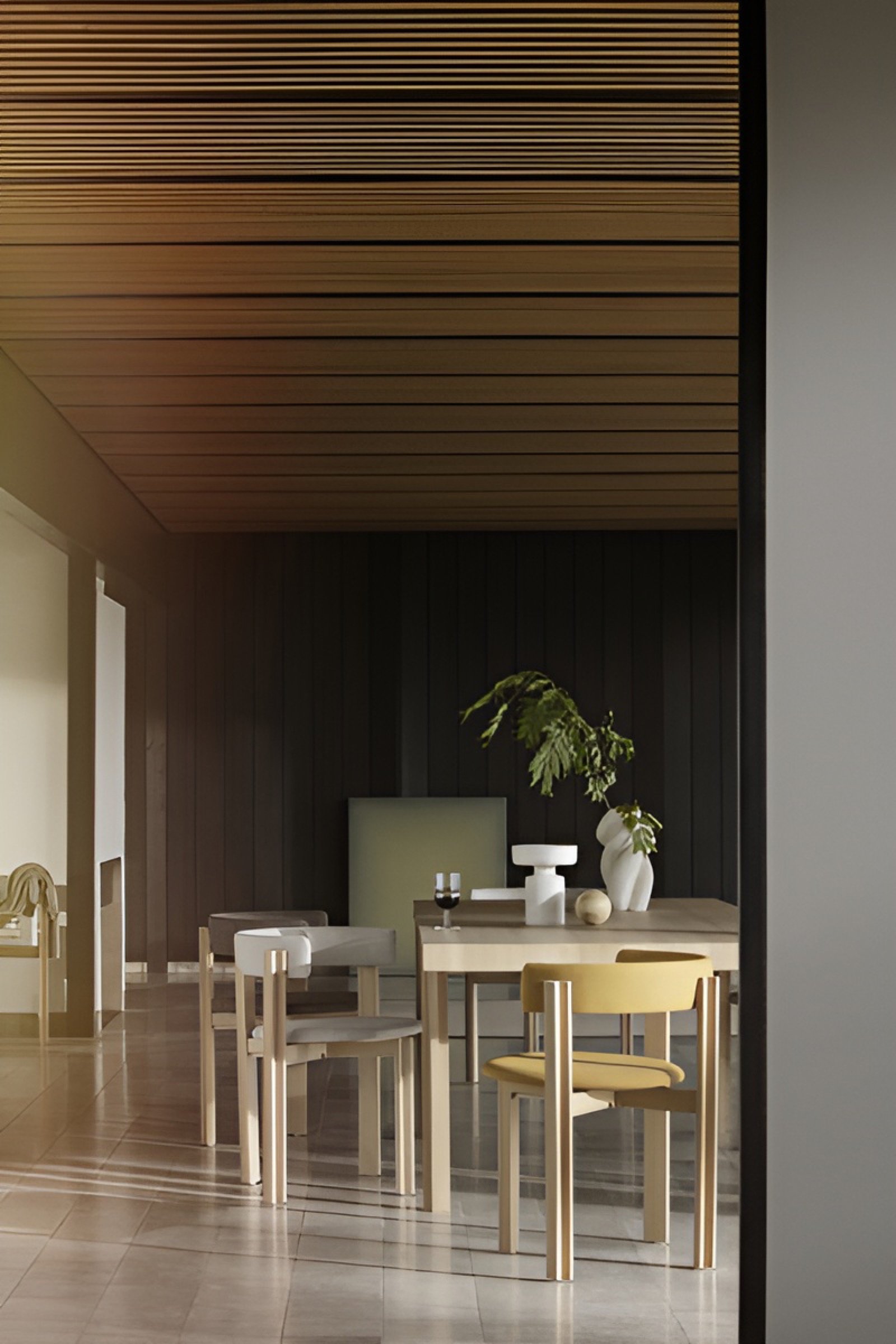 Обеденный стол из массива дерева отличается четкой формой, повторяющей простой угол на ножках и концах столешницы, а обеденный стул с круглым сиденьем и плавно изогнутой спинкой, красиво обитый, добавляет мягкости четкой, лаконичной геометрии, приглашая задержаться.