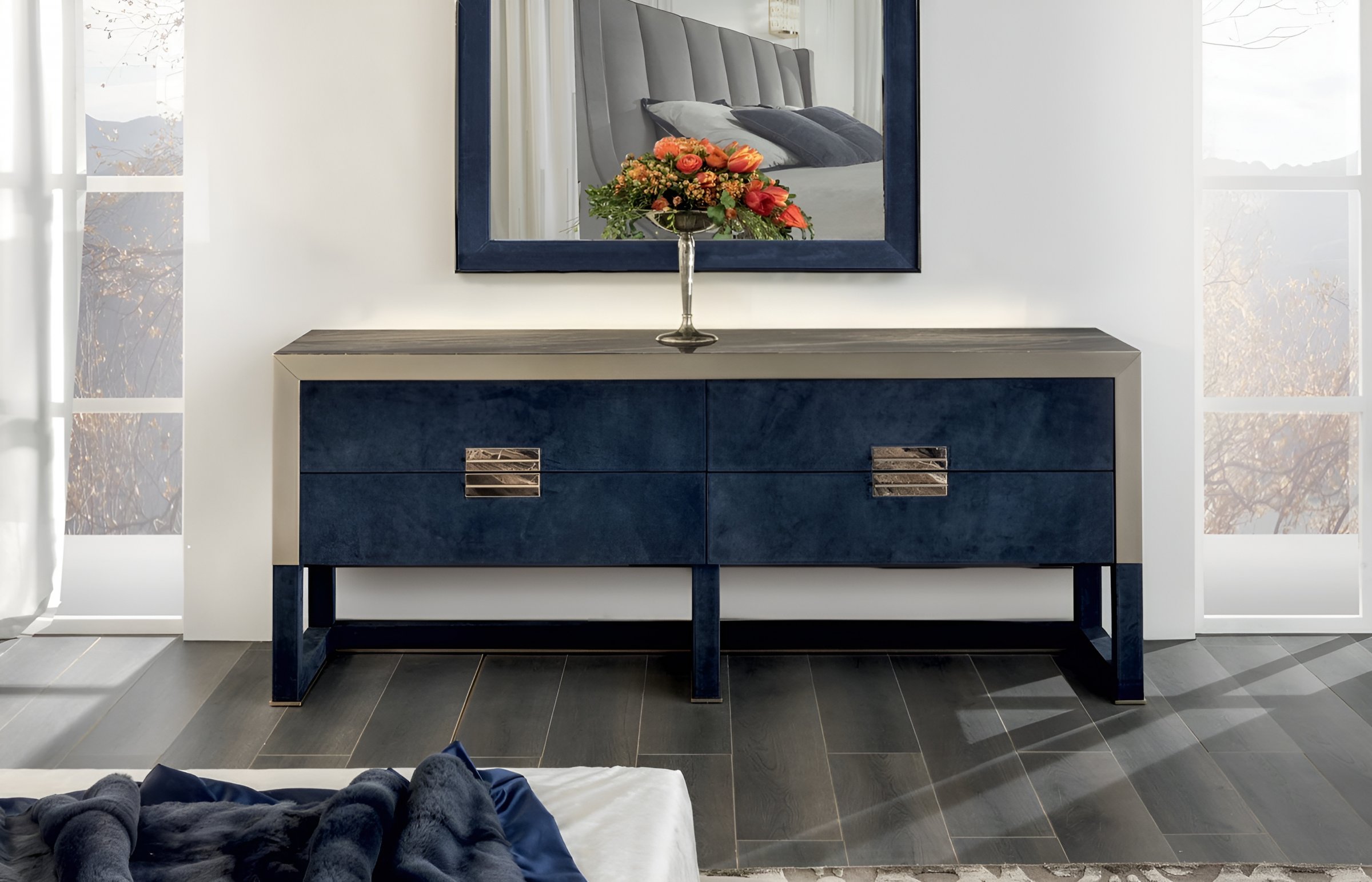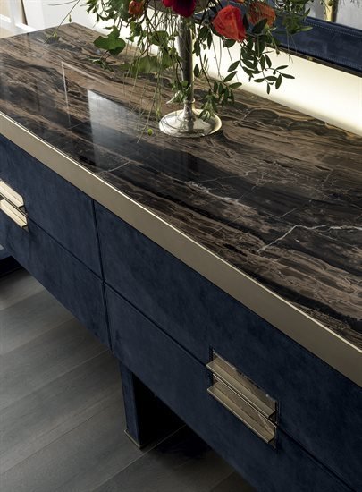 Профили основания и рама по периметру выполнены из металла, а фасады могут быть покрыты кожей или кашемиром или деревом в соответствии с сущностью основания. Важные детали: ручка с мраморной вставкой и светодиодное освещение с регулируемой яркостью.