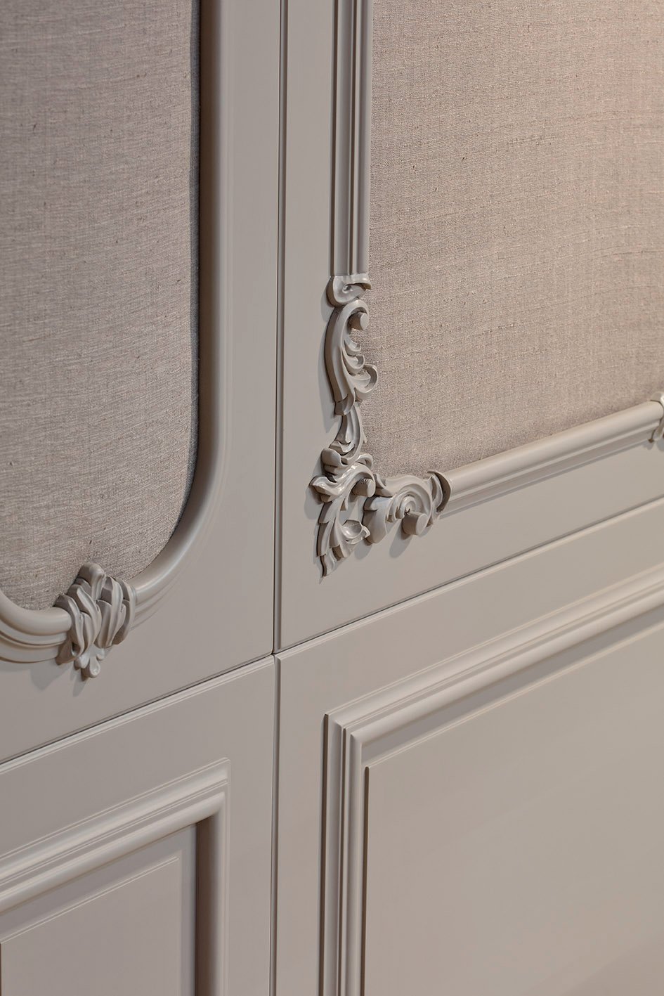 Элегантная и функциональная система стеновых панелей Floral Botanica имеет индивидуальную структуру, с убирающимися и выдвижными створками, полками и открытыми или закрытыми отсеками, в зависимости от потребностей и назначения различных секций. Она также может включать в себя межкомнатные двери, которые, таким образом, интегрируются в стенные панели буазери.