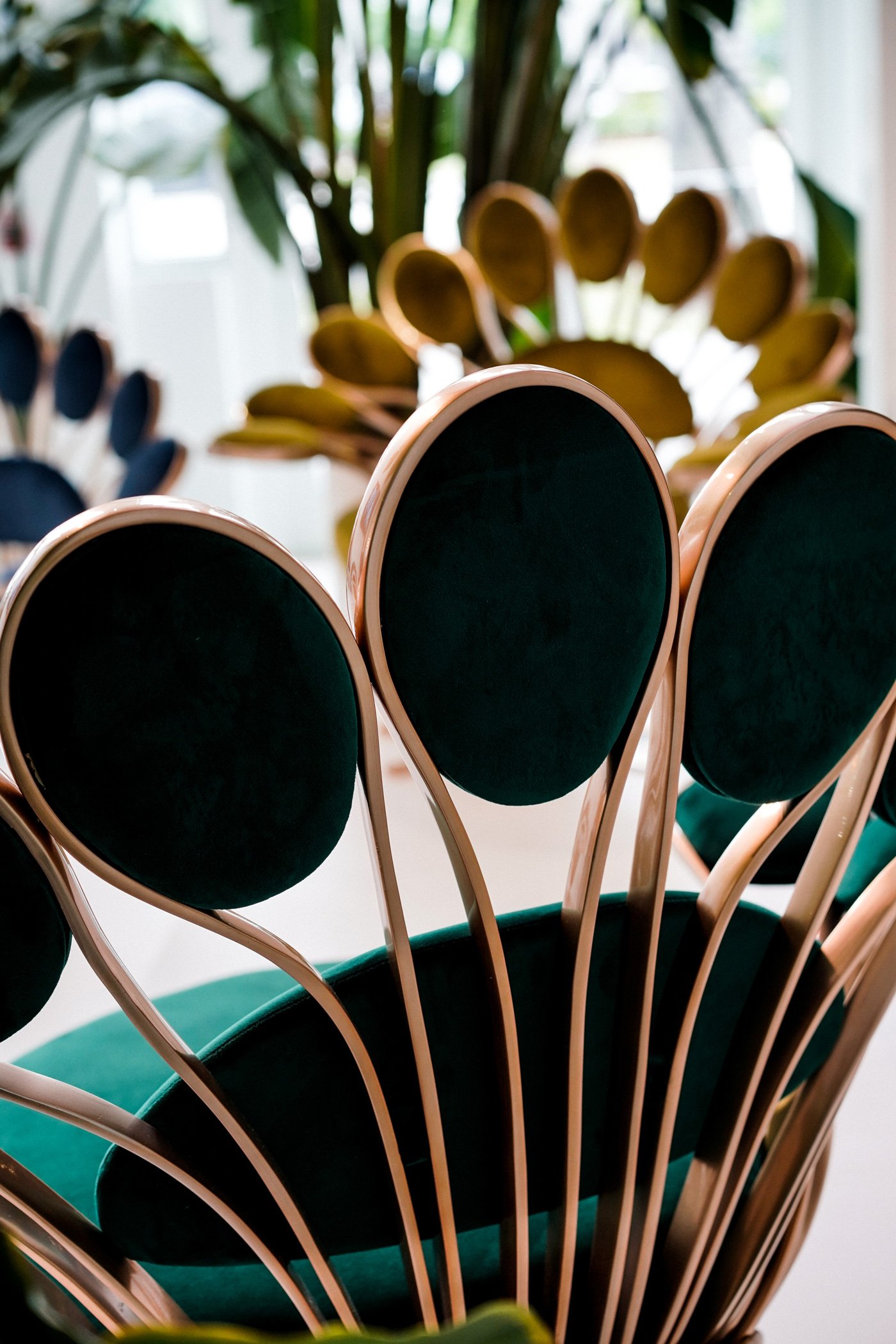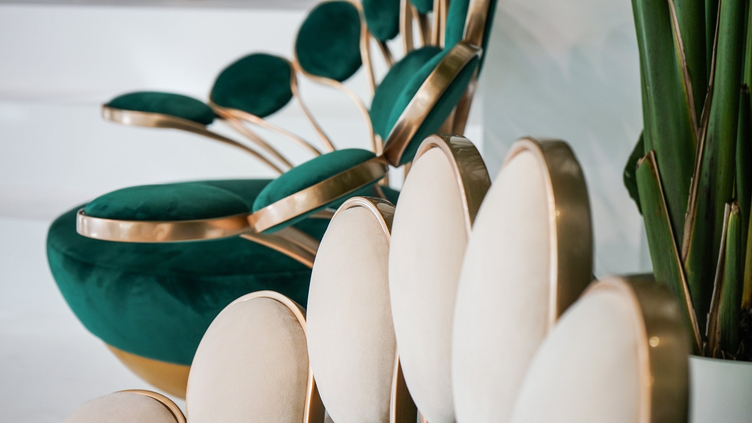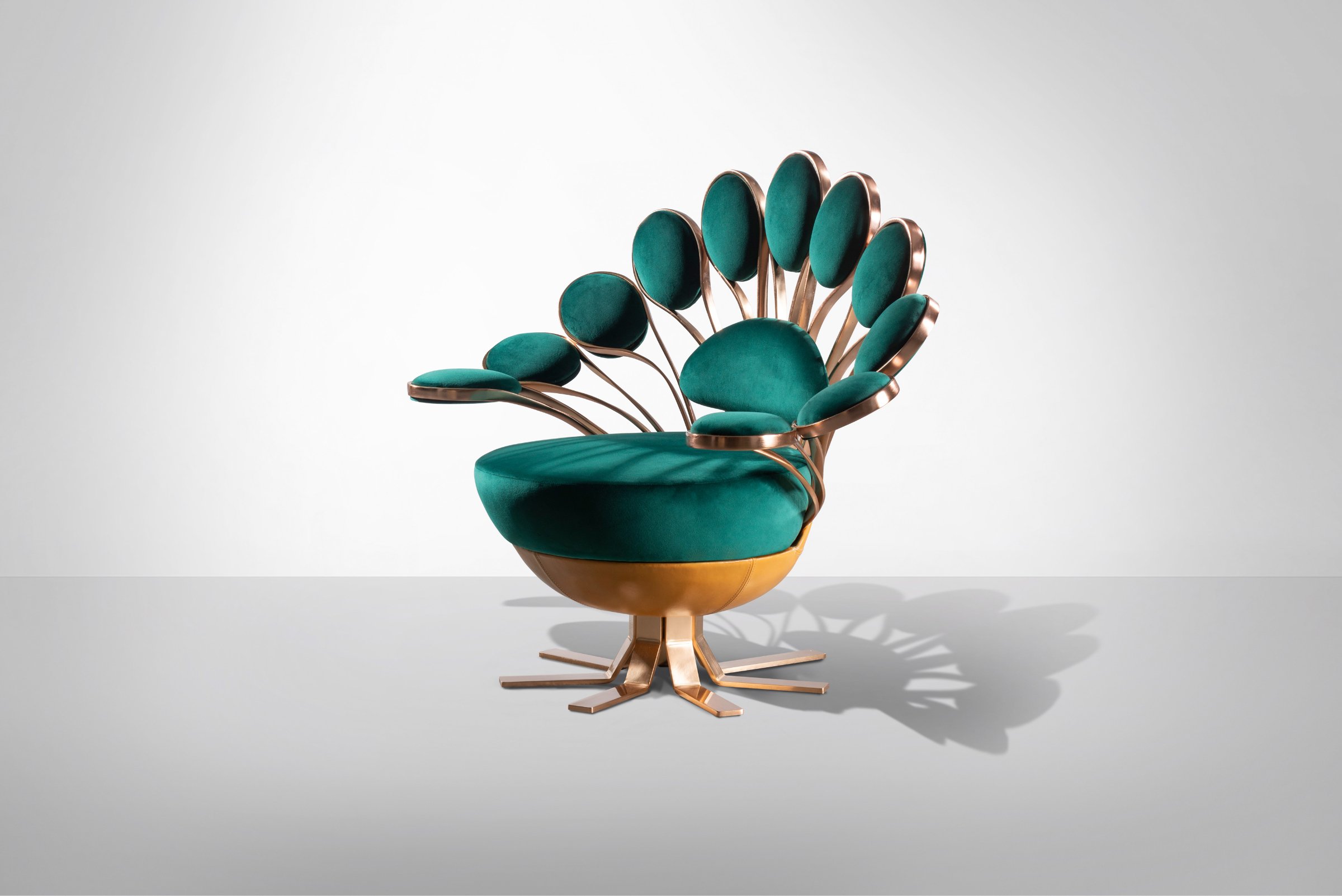 Кресло с кожаной и тканевой обивкой. Внутренняя конструкция сиденья из тополиной фанеры, обивка из пенополиуретана разной плотности. Основание из 7 элементов из хромированной стали. Подлокотники и спинка из изогнутых элементов из полированной вручную хромированной латуни в комплекте с подушками с индивидуальной обивкой.