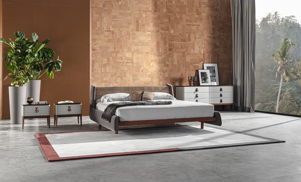 Отличительной особенностью изделия являются скошенные боковые планки. Сочетание материалов и цветов, доступных для обивки, позволяет создавать бесчисленное множество вариантов.