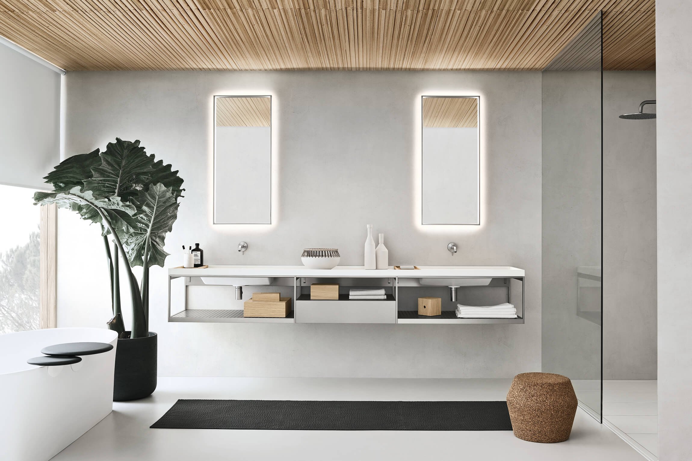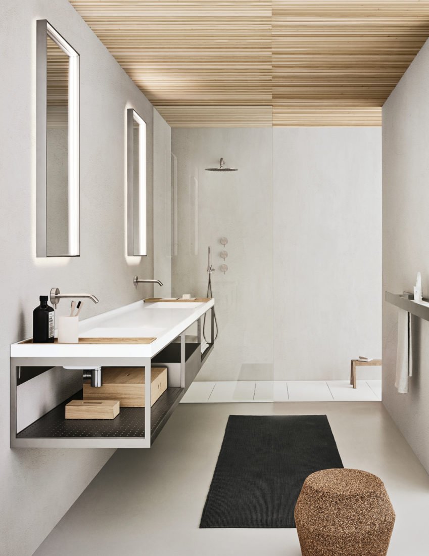 Открытые элементы с рамой и полкой из рустованного алюминия с платиновым лаком. Основание с выдвижным ящиком и дневным отсеком из платинового лака. Зеркало Ekos V со светодиодной подсветкой с четырьмя сторонами и светодиодным освещением с двумя вертикальными сторонами внутри, алюминиевый профиль с платиновым лаком. Полки Ljos из алюминия с платиновым лаком, в комплекте с аксессуарами и светодиодной подсветкой. Смесители Flow из матовой нержавеющей стали с прогрессивным картриджем.