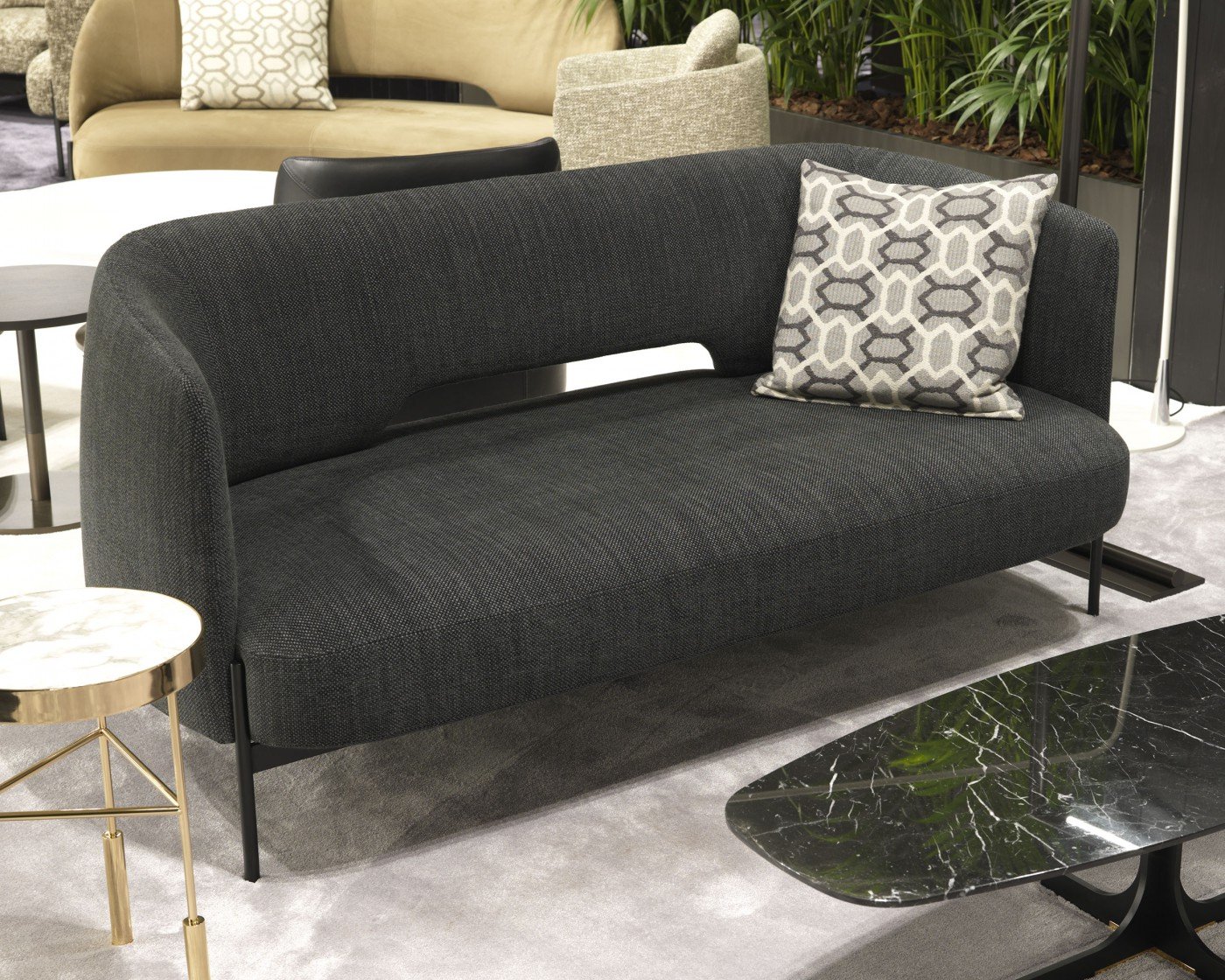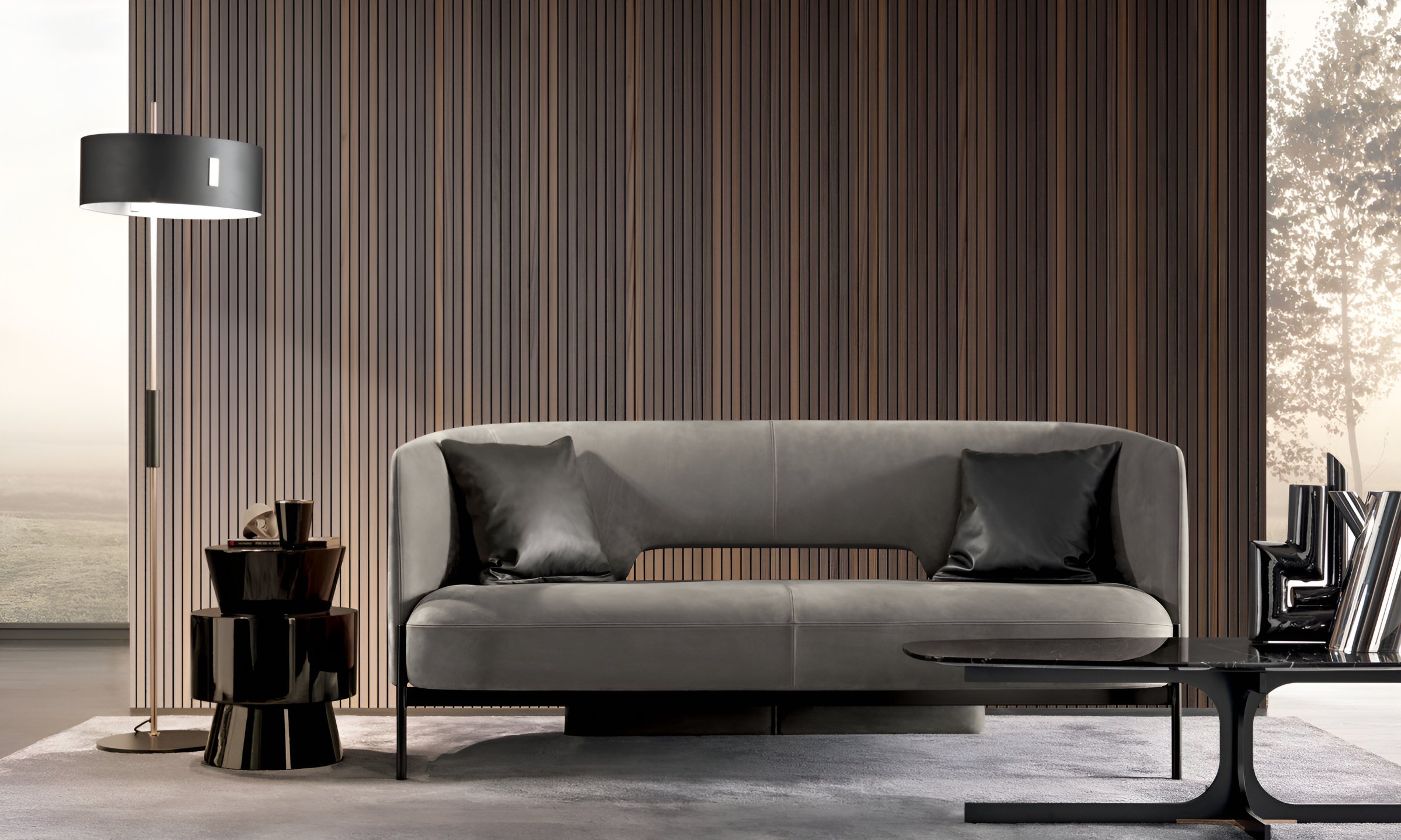 Спинка и подлокотники сливаются в единое функциональное мягкое изголовье, обрамляющее глубокое сиденье, которое становится задней опорой, меняя свой облик и назначение. Стратегический зазор между сиденьем и спинкой облегчает вес конструкции.