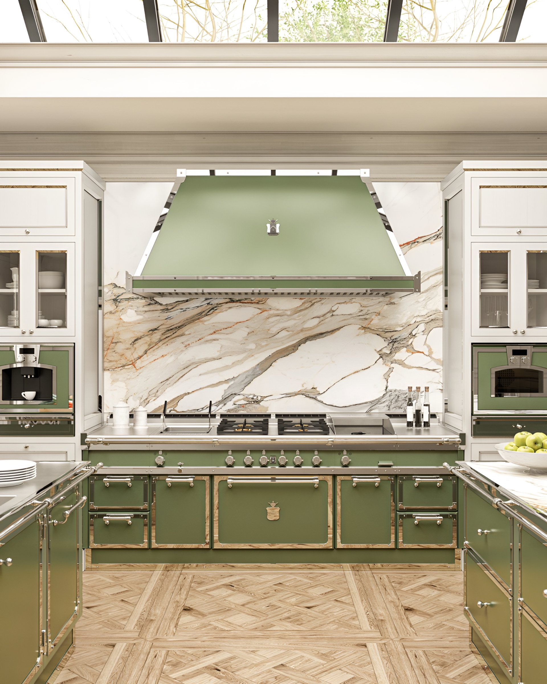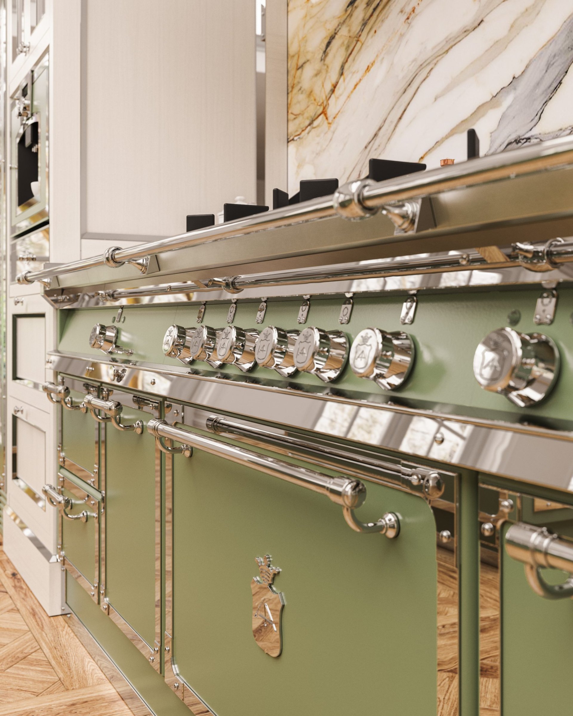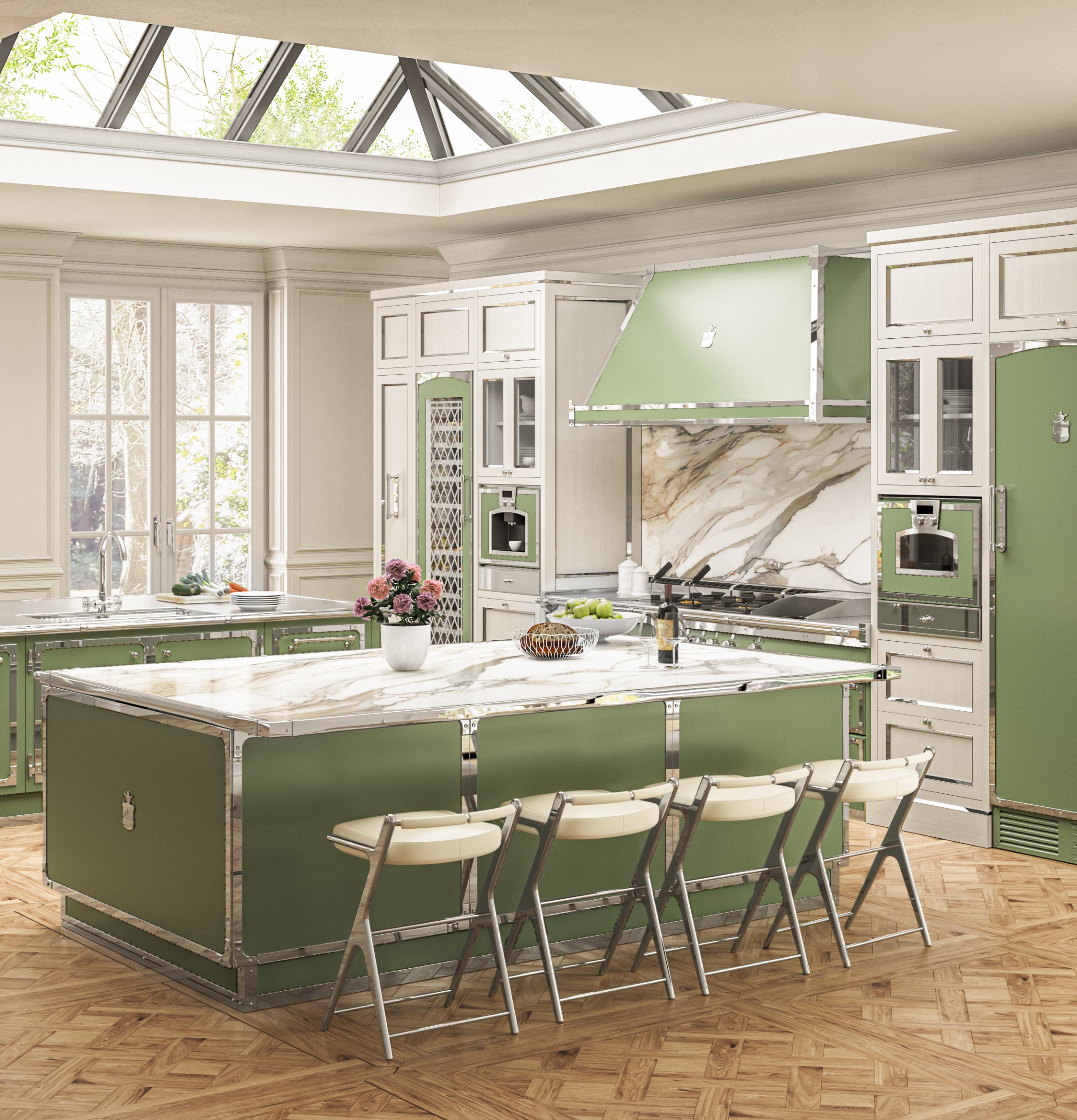 Этот индивидуальный проект состоит из индивидуальной машины для приготовления пищи, колонны бытовой техники, состоящей из двух духовок, подогревателя пищи, кофейной машины и холодильника. Все это стоит перед двумя островами, которые занимают центральное пространство кухни, точно под стеклянным приамидом, освещающим всю комнату.