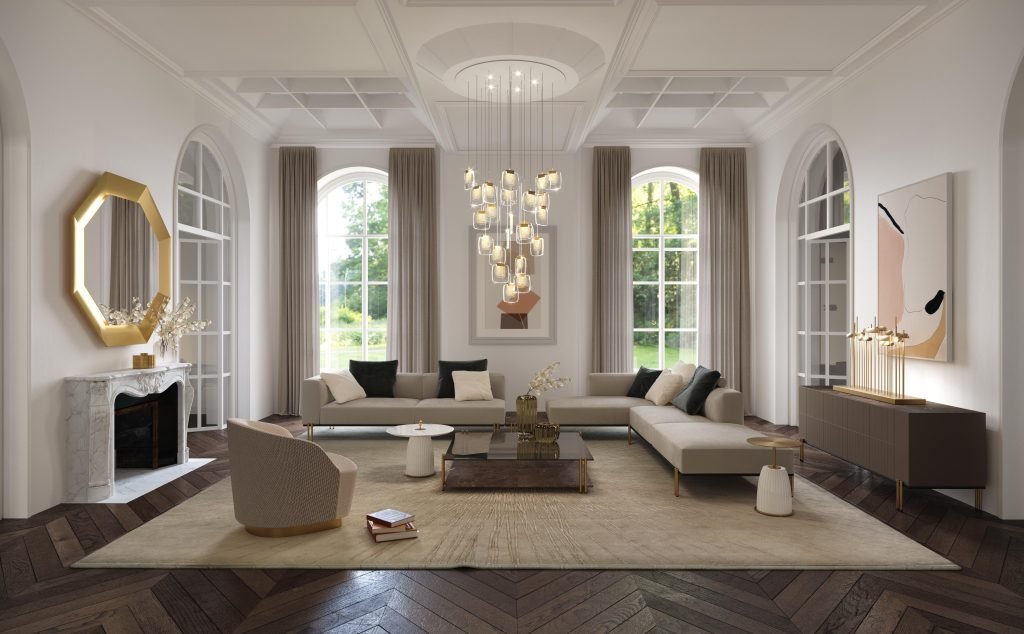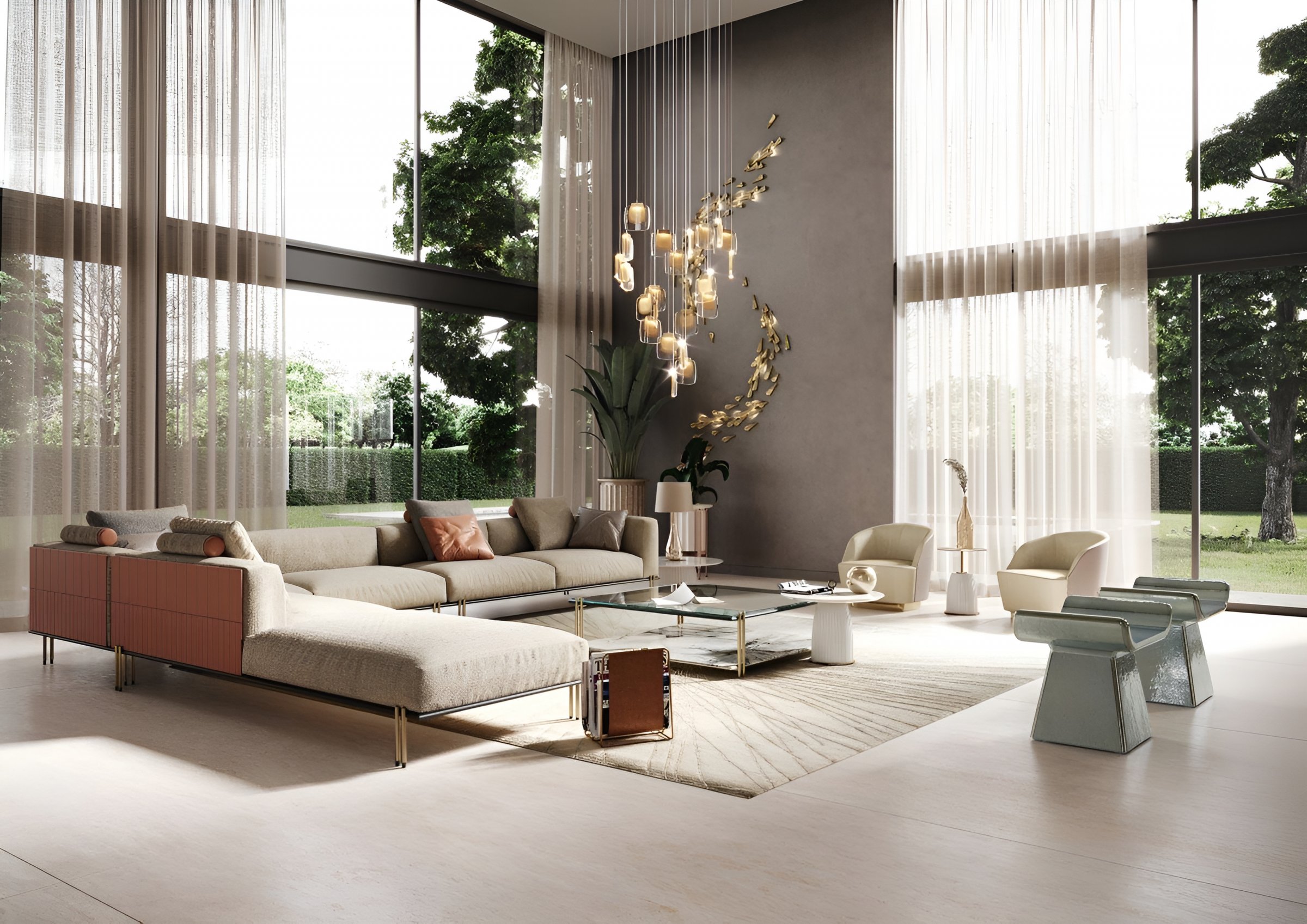 Подушки сиденья и спинки несъёмные и изготовлены из пенополиуретана разной плотности. В модуле шезлонга со встроенным журнальным столиком столешница изготовлена из травертина.