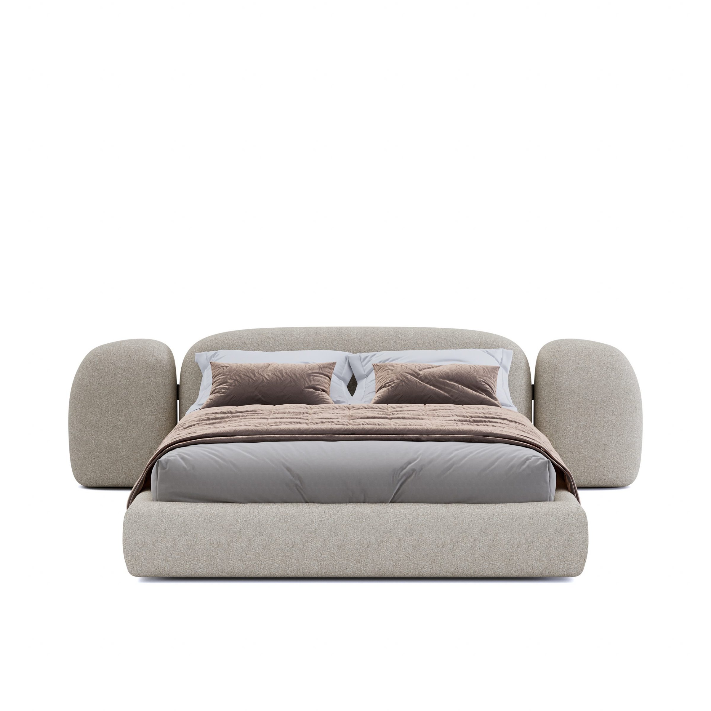 Каркас и ножки кровати изготовлены из экологически чистого массива ясеня, а мягкое изголовье и каркас кровати — из органического каучука и натурального наполнителя. Даже обивка из букле-шерсти имеет натуральную и экологичную основу. Кровать VAO оснащена двумя подвижными боковыми «крыльями», которые закрывают прикроватные тумбочки.