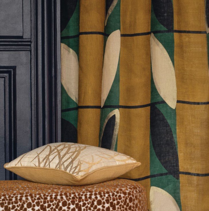 Изысканные шелка, вуали, ламинированные золотом или серебром, в сочетании с крупными принтами, узорами в виде листьев на льне и геометрическими вышивками на стыке ар-деко и креольского искусства. Новая шерсть, хлопок, лён, джут и бамбук дополняют каждую из наших тканей.