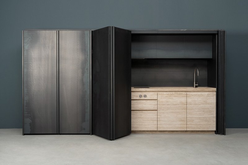 Вся функциональность и дизайн кухни Vaselli скрыты за простой и элегантной раздвижной стеной из стального листа, которая открывается и закрывается одним движением руки.