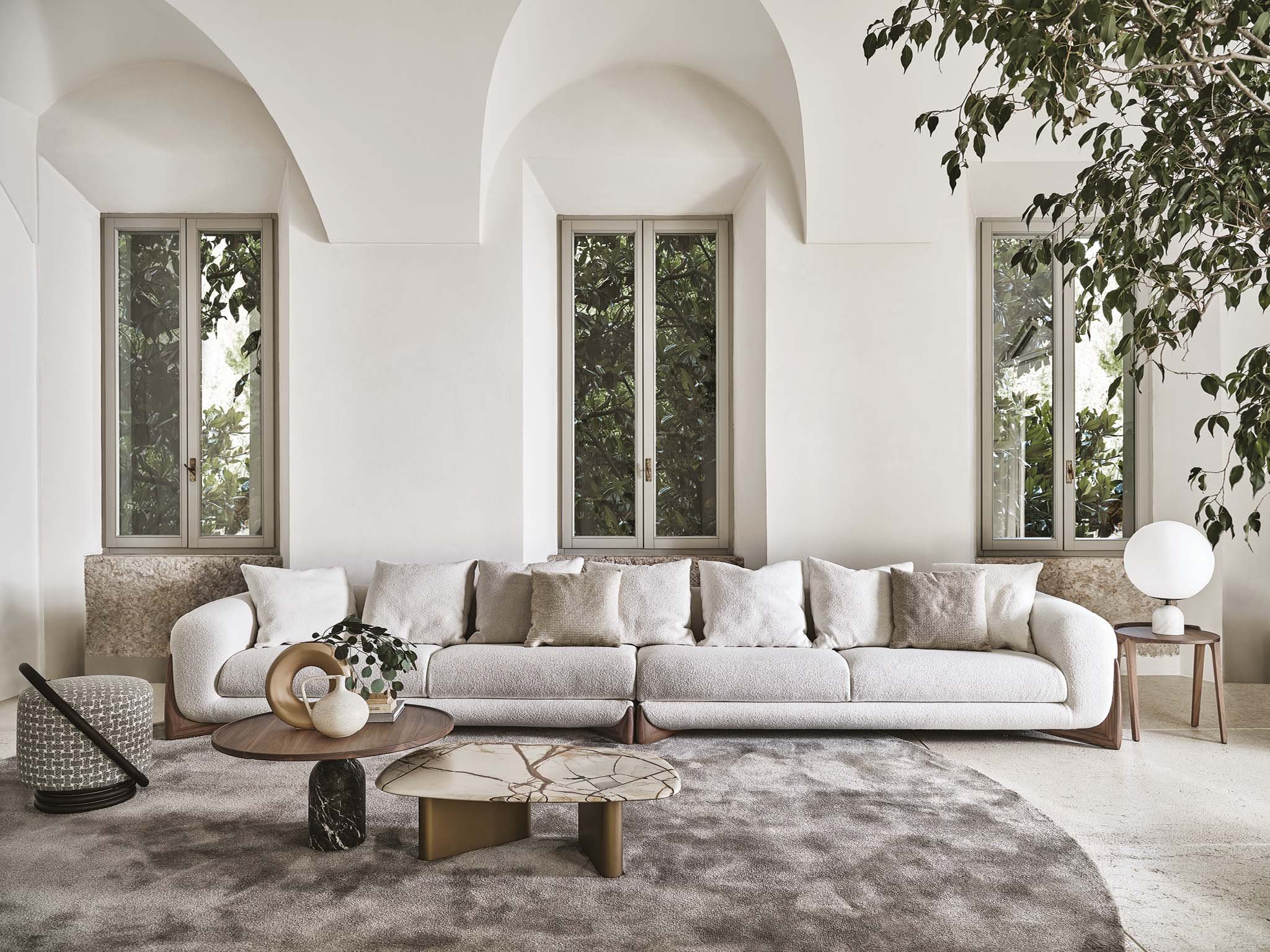Обивка, лучше всего подчеркивающая все элементы, — это, несомненно, ткань Bouclage, драгоценная смесь хлопка, льна и шерсти, но наличие в коллекции обивки из разных тканей и кож делает семейство Softbay подходящим для самых разнообразных жизненных потребностей.