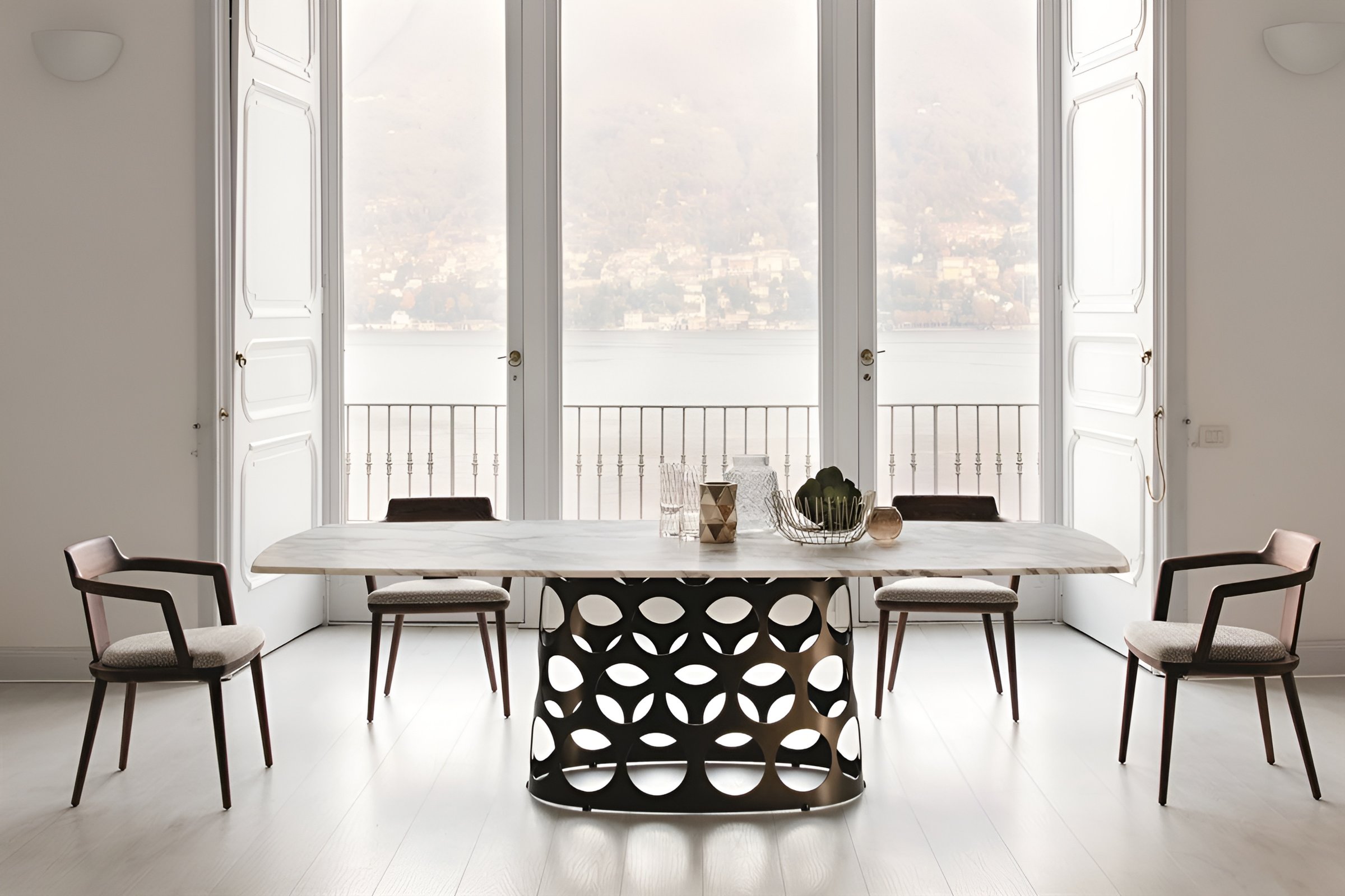 Кроме того, его центральное положение по отношению к столешнице обеспечивает большую гибкость, оставляя полную свободу в расстановке обеденных стульев вокруг стола.