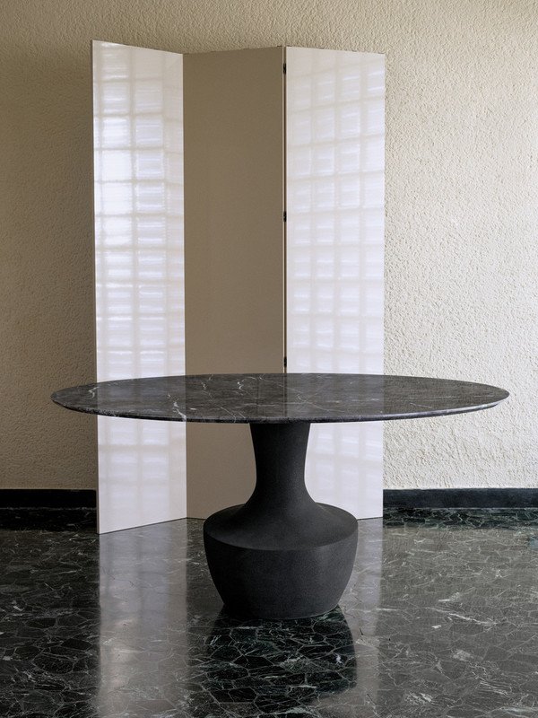 Круглый стол Anfora в двух размерах предлагается с новой отделкой как для основания, так и для столешницы.