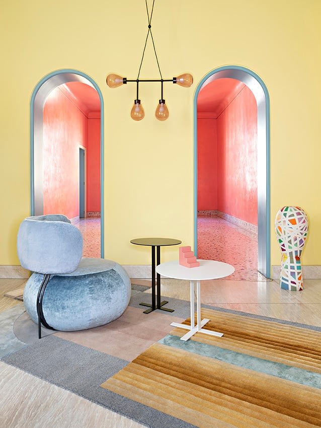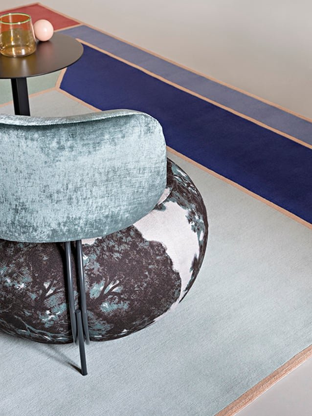 Металлическая конструкция из стержней поддерживает изогнутую деревянную спинку с мягкой обивкой. Пропорции кресла внушительные, но не слишком громоздкие. Пуфы Geo высотой 75 см сконструированы таким образом, чтобы соответствовать конструкции спинки, и могут быть легко прикреплены к основанию пуфа даже позже. Полностью съёмные чехлы.