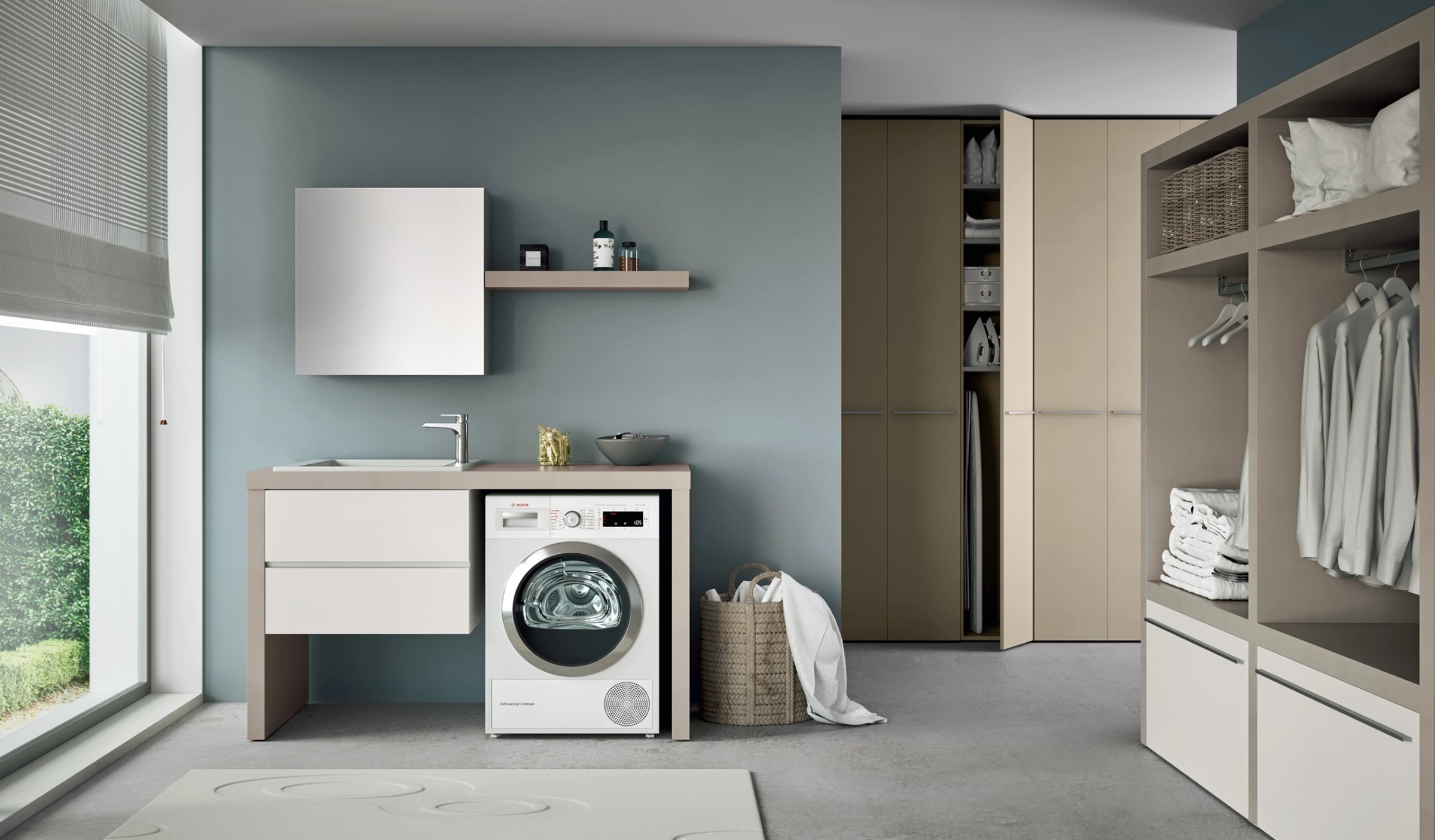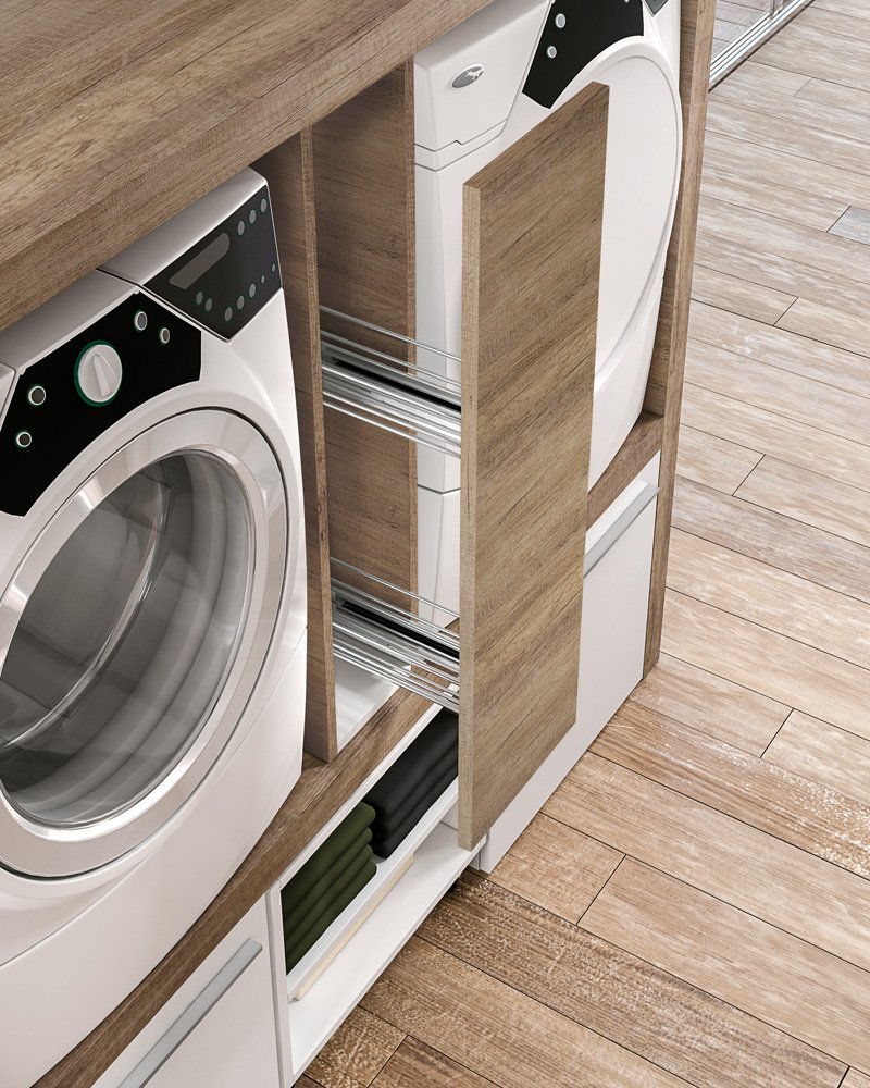 Функциональная геометрия подходит для малых и больших сред. Мебель для прачечной из коллекции Store делает каждый уголок эффективным благодаря возможности создавать свою среду с помощью специальных оборудованных модулей: шкаф для стиральной машины и сушилки, шкаф с раковиной, навесные шкафы, комоды и шкафы.