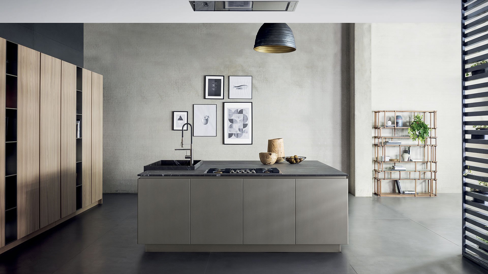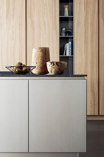 Тщательно подобранные натуральные материалы сочетаются с оригинальной отделкой и деталями. Качество дизайна позволяет создать уникальный стиль, гармонирующий с пространством. Большой остров становится центром домашней жизни. Изысканная и продуманная естественность, способная придать пространству сбалансированную индивидуальность, в основе которой лежат самые интимные материалы. Решение, подходящее для открытых пространств, для архитектурных решений, характеризующихся новыми образами и размерами. Модель T45, использованная в этой композиции, обеспечивает максимальную композиционную гибкость и свободу в выборе отделки.
