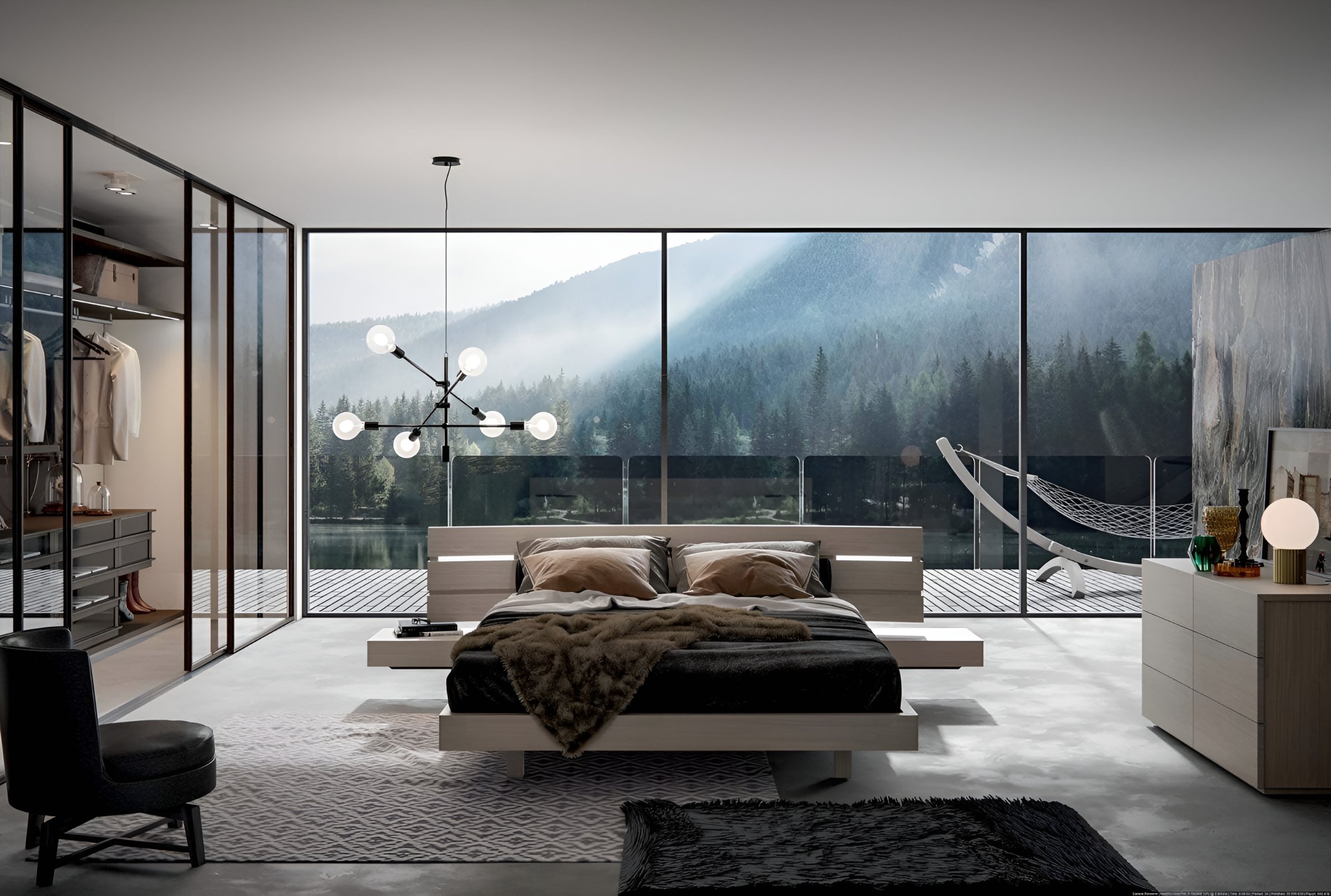В рабочей кровати обзор имеет большой эффект сцены, благодаря подвесным тумбочкам, встроенным в кольцо, и просторному, а также обволакивающему изголовью со встроенными светодиодными лампами.