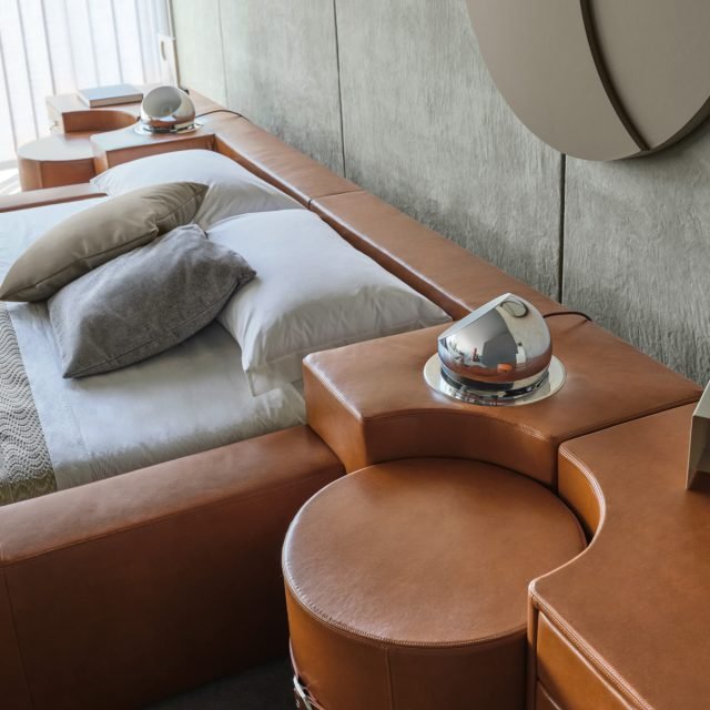 Коллекция включает в себя стул, стол, кресло для отдыха, кровать, прикроватные тумбочки и оригинальный вращающийся туалетный столик; все они отличаются уникальным комфортом и стилем.