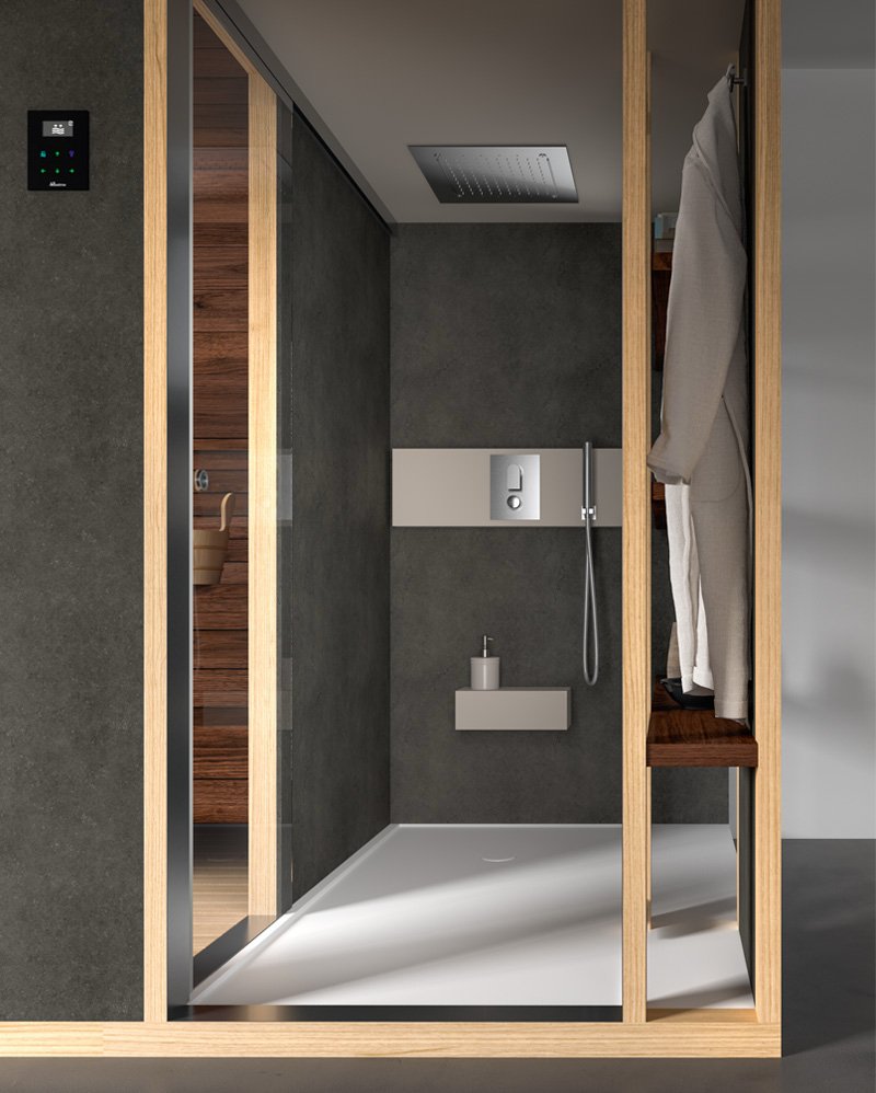 Сочетание функций, улучшающих самочувствие: сауна + душ + оборудованное пространство со скамейкой для отдыха после сауны. Интегрированные элементы мебели с основным дизайном дополняют недавно разработанные интеллектуальные объемы.