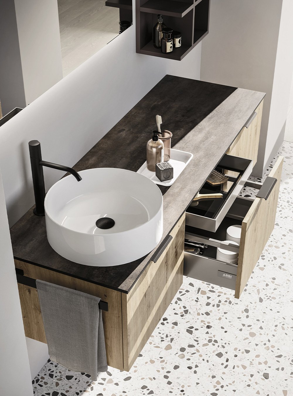 Ho.Me Plus — это инновационная коллекция от Arbi Arredobagno, в которой представлен широкий ассортимент термоструктурированного меламина с естественными прожилками, классическими или модными цветами. Коллекция доступна в двух вариантах: с плоской передней частью и ручкой, а также со встроенной ручкой в форме буквы «J». Благодаря модульной конструкции, позволяющей выбирать между тремя вариантами глубины и разной шириной, коллекция дополнена изогнутой версией, которая предлагает базовые элементы с плавными линиями, чтобы удовлетворить даже самые взыскательные требования к оптимизации небольших пространств.