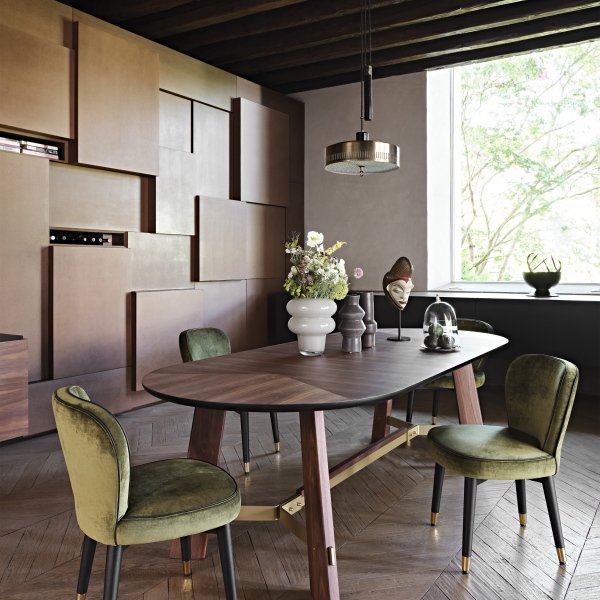 Подставка для ног из матового золота подчеркивает и гармонизирует элегантность этого стола, который с изысканной простотой вписывается в жилую, контрактную и офисную среду.