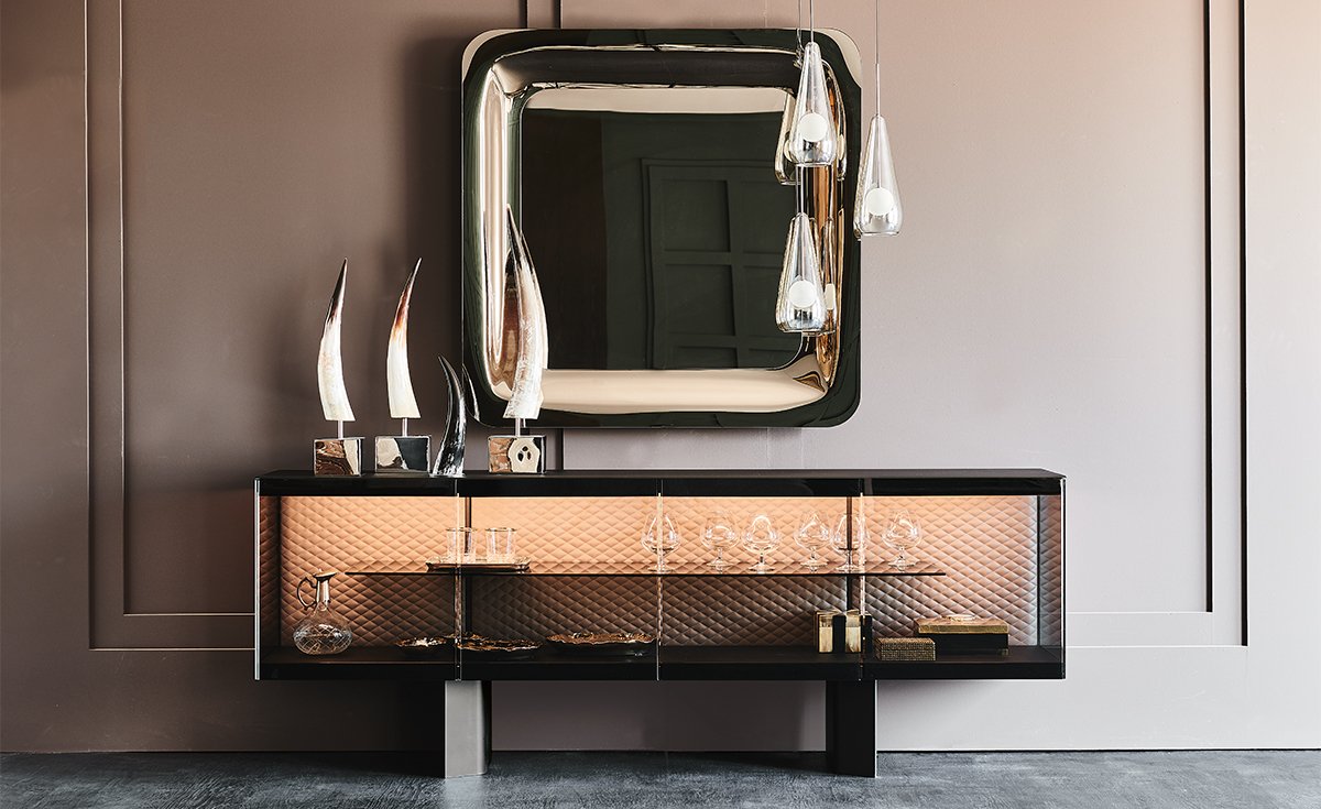 Внутренние стеклянные полки, мягкая обивка спинки и светодиодные лампы — все эти детали призваны подчеркнуть ценность предметов, которые хранятся в этом дизайнерском шкафу, украшающем гостиную с изысканным вкусом. Коллекция современных буфетов Boutique состоит из двух вариантов с 4 дверцами разной высоты и более высокого буфета Boutique Alta с 3 полками.