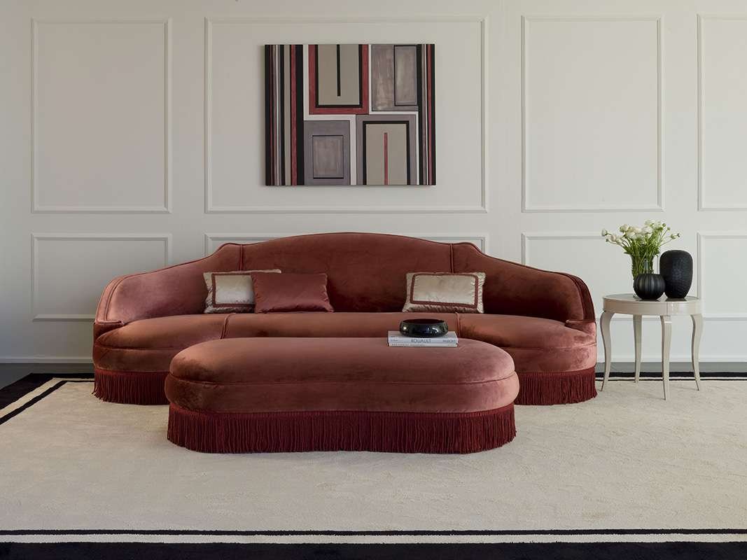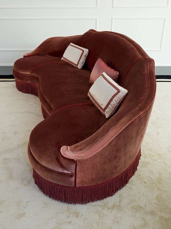Уникальная и изогнутая форма его конструкции, покрытой изысканной тканью, имеет закруглённые и мягкие углы и дополнена очаровательным декором в виде бахромы, которая создаёт удивительное ощущение движения под сиденьем.