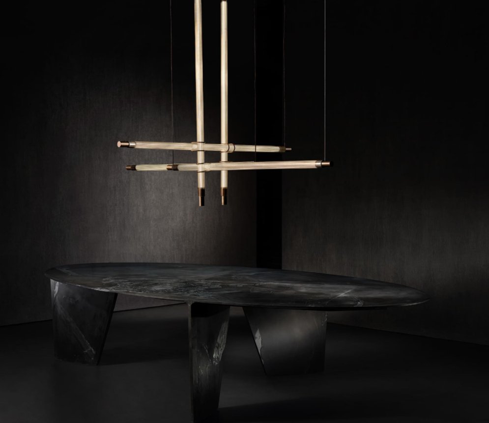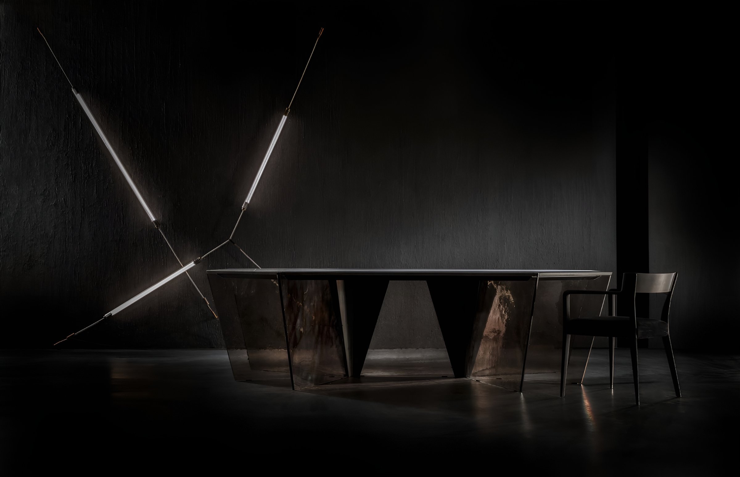 Модель Synapse представляет собой овальную или круглую столешницу, опирающуюся на три равномерно расположенные ножки. Модель выполнена в виде элитного предмета одежды, в котором, казалось бы, контрастные формы идеально сочетаются в строгой геометрии.