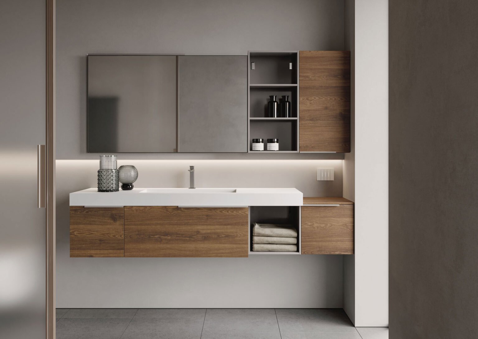 Дополняется хрустальными полками (sp. 1, глубина 12 см) или в отделке (СП. 1,2 см, глубина 12 см) с алюминиевыми опорами, полированным хромом или черным, которые можно прикрепить непосредственно к туалетному столику (без отверстий в стенах).