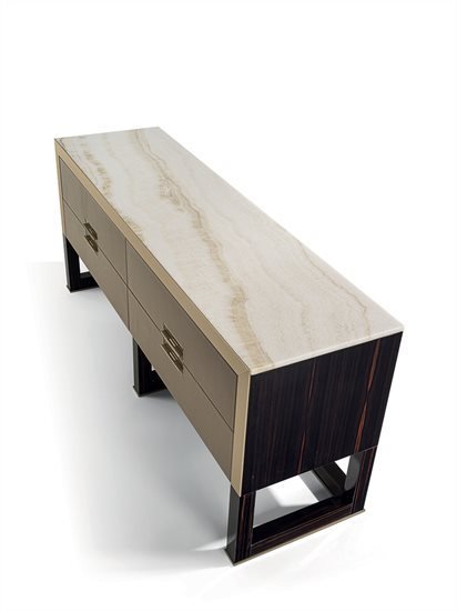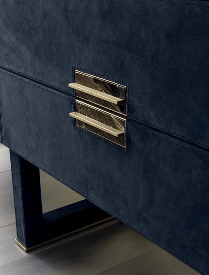 Профили основания и рама по периметру выполнены из металла, а фасады могут быть покрыты кожей или кашемиром или деревом в соответствии с сущностью основания. Важные детали: ручка с мраморной вставкой и светодиодное освещение с регулируемой яркостью.