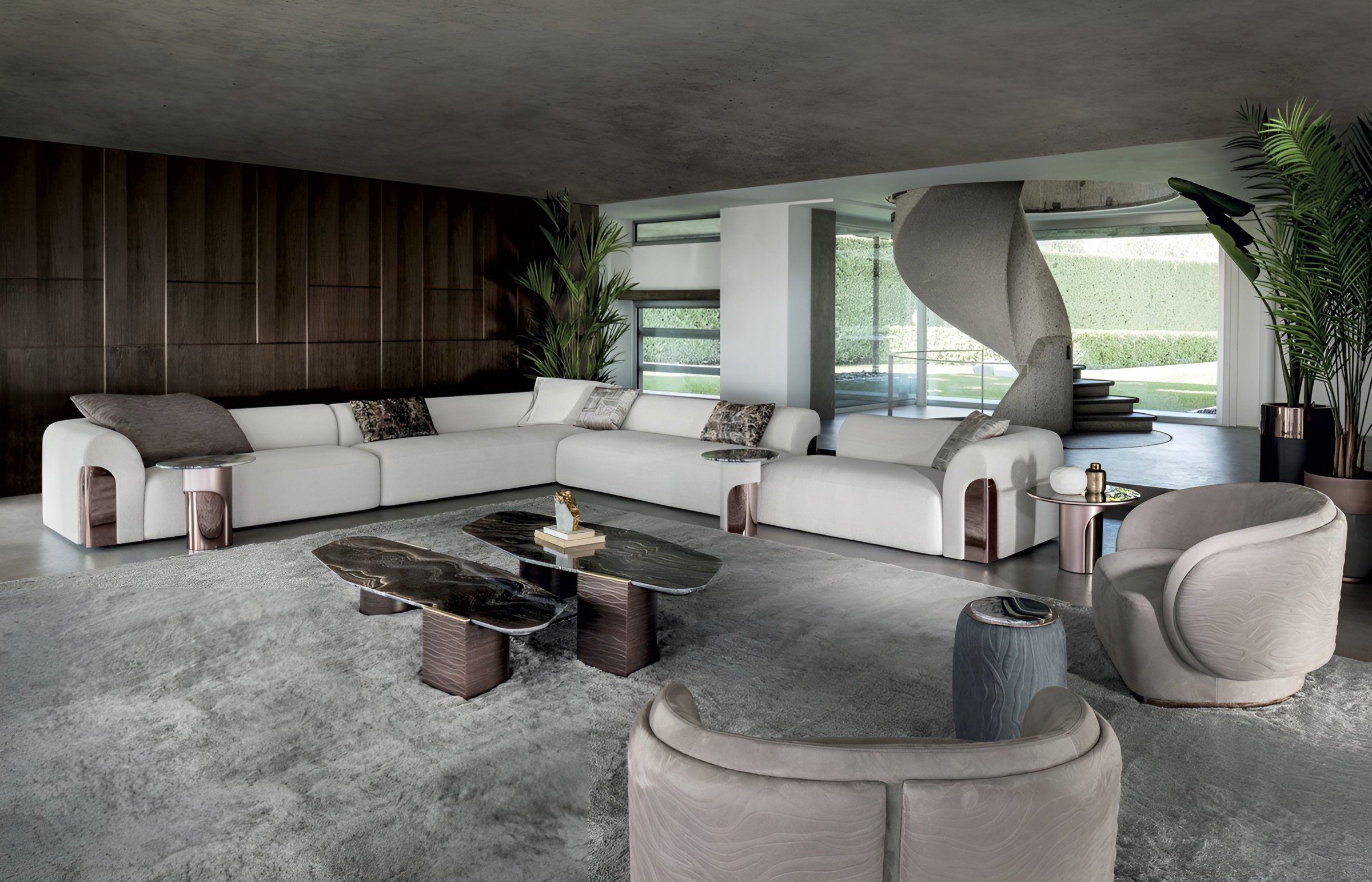 Диван состоит из элементов простых очертаний, идеально подходящих для линейных или угловых композиций. В подлокотники и в открытые спинки вставлена хромированная металлическая пластина, подчеркивающая извилистые формы различных элементов, с отделкой: медный деграде, коричневый деграде глянц, золото Black Rose, глянцевое светлое золото, матовое оттенка Шампанского, глянцевый хром, глянцевый черный хром, матовая сатинированная бронза. Большое внимание было уделено удобству, для чего используется несколько видов специального пенополиуретана, придающие мягкую упругость и устойчивость к смятию, а сиденья опираются в основании на специальные эластичные рейки из ПВХ, установленные на прочный деревянный каркас. Еще одной отличительной особенностью является выполняемый на заказ эксклюзивный декор в виде простежки «Groove», опоясывающий фронтальную часть различных элементов.