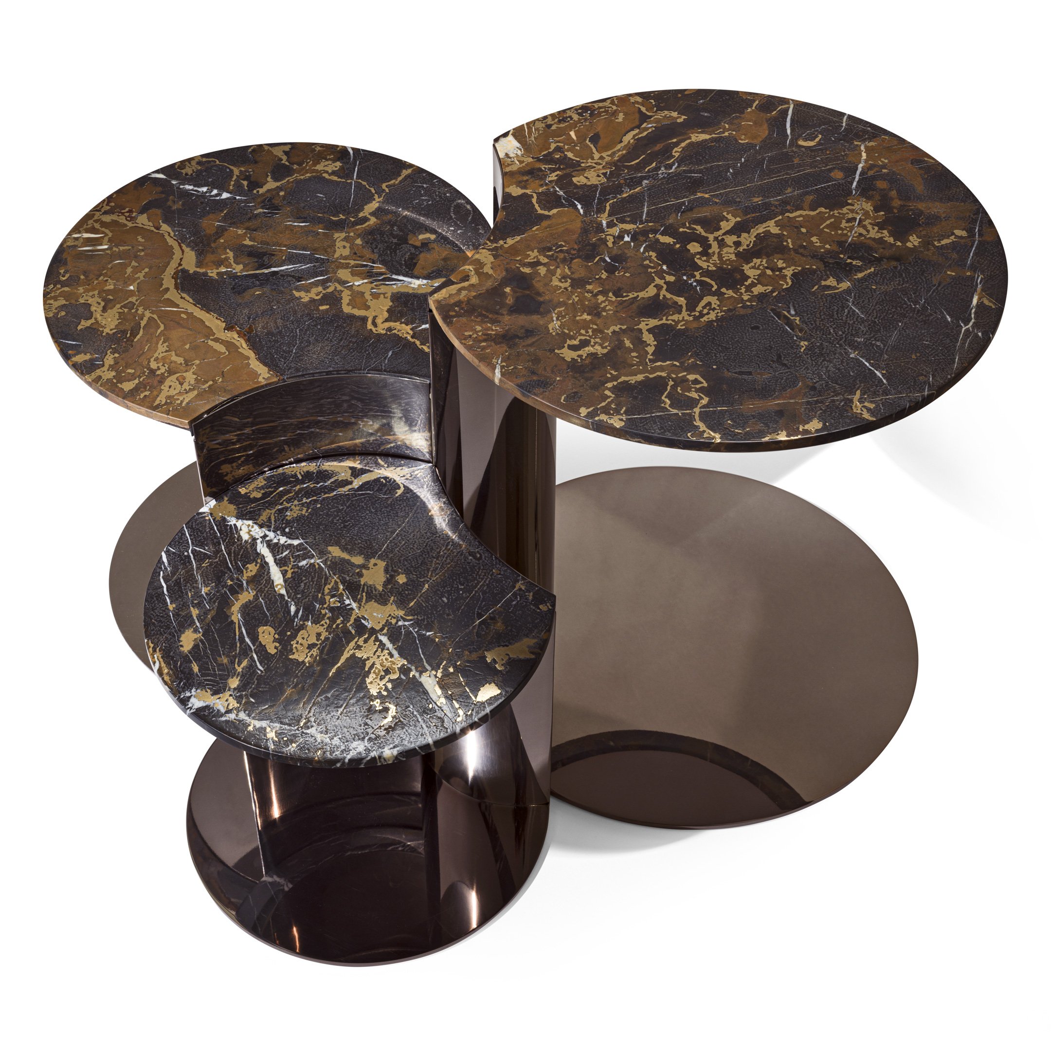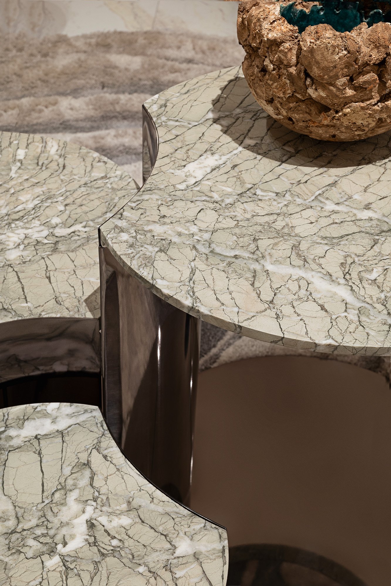 Ножка из полированной стали смещена от центра, вогнутая часть переходит в аналогичную по форме мраморную столешницу. Столешница из полированного мрамора с граненой отделкой нижнего края. Возможна опция “invisible grey marble - leather nishing” с обработкой поверхности золотым, бронзовым или марганцевым лаком. Металлические детали, которые также можно приобрести отдельно, доступны в различных видах глянцевой отделки. Дополнительный вариант: декорирование жидким золотом с восковой полировкой для мрамора Invisible Grey, Black & Gold, Ivory Onyx, Velvet Onyx.