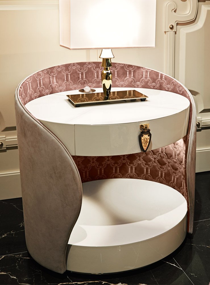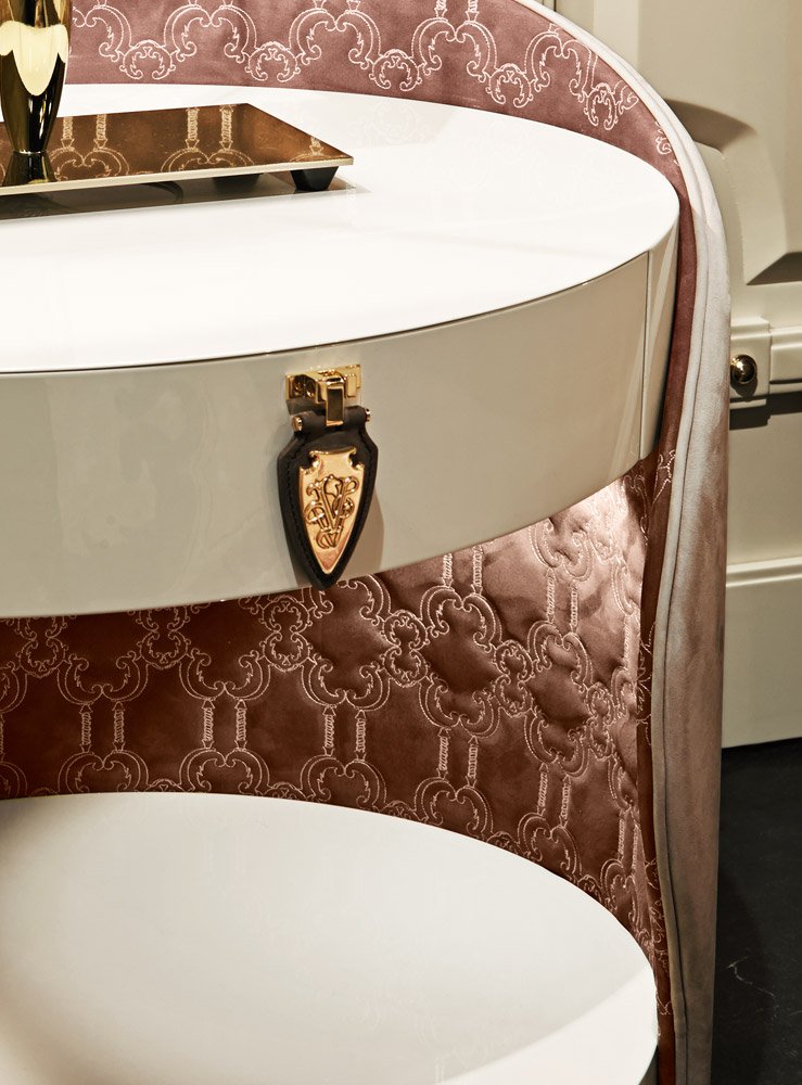 Опорная рама из массива бука и фанеры. Сиденье с эластичными ремнями на буковой раме. Обивка спинки и подлокотников из пенополиуретана. Подушки сидений из пенополиуретана различной плотности, полужесткие внизу и мягкие вверху. Задняя часть спинки и боковины с наполнением из акрилового волокна с подложкой из акрилового вельвета. Обивка внешних сторон подлокотников и верхнего края спинки в технике капитоне с пуговицами. Передние и задние ножки обиты кожей или тканью. Передние ножки украшены поворотными латунными кольцами с выгравированным овальным мотивом и овальным латунным медальоном с геральдической символикой Visionnaire. Опция: вышивка геральдической символики Visionnaire на спинке.