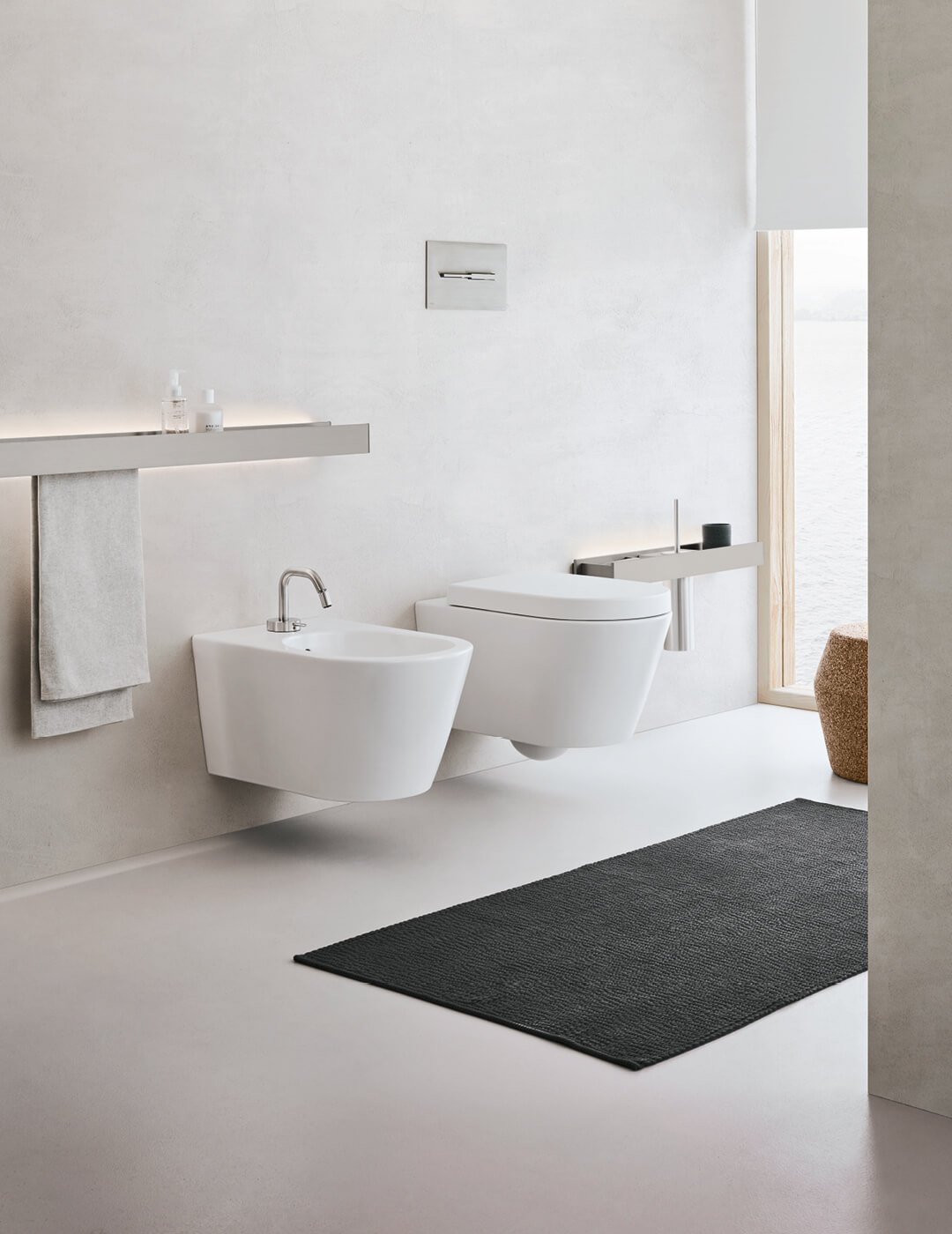 Открытые элементы с рамой и полкой из рустованного алюминия с платиновым лаком. Основание с выдвижным ящиком и дневным отсеком из платинового лака. Зеркало Ekos V со светодиодной подсветкой с четырьмя сторонами и светодиодным освещением с двумя вертикальными сторонами внутри, алюминиевый профиль с платиновым лаком. Полки Ljos из алюминия с платиновым лаком, в комплекте с аксессуарами и светодиодной подсветкой. Смесители Flow из матовой нержавеющей стали с прогрессивным картриджем.