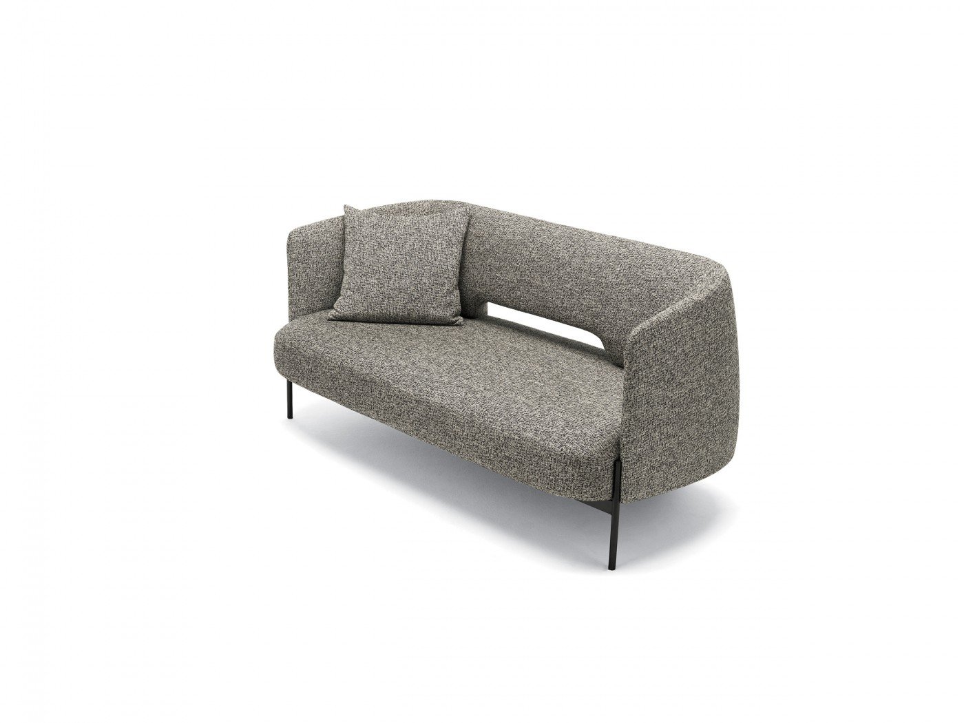 Спинка и подлокотники сливаются в единое функциональное мягкое изголовье, обрамляющее глубокое сиденье, которое становится задней опорой, меняя свой облик и назначение. Стратегический зазор между сиденьем и спинкой облегчает вес конструкции.