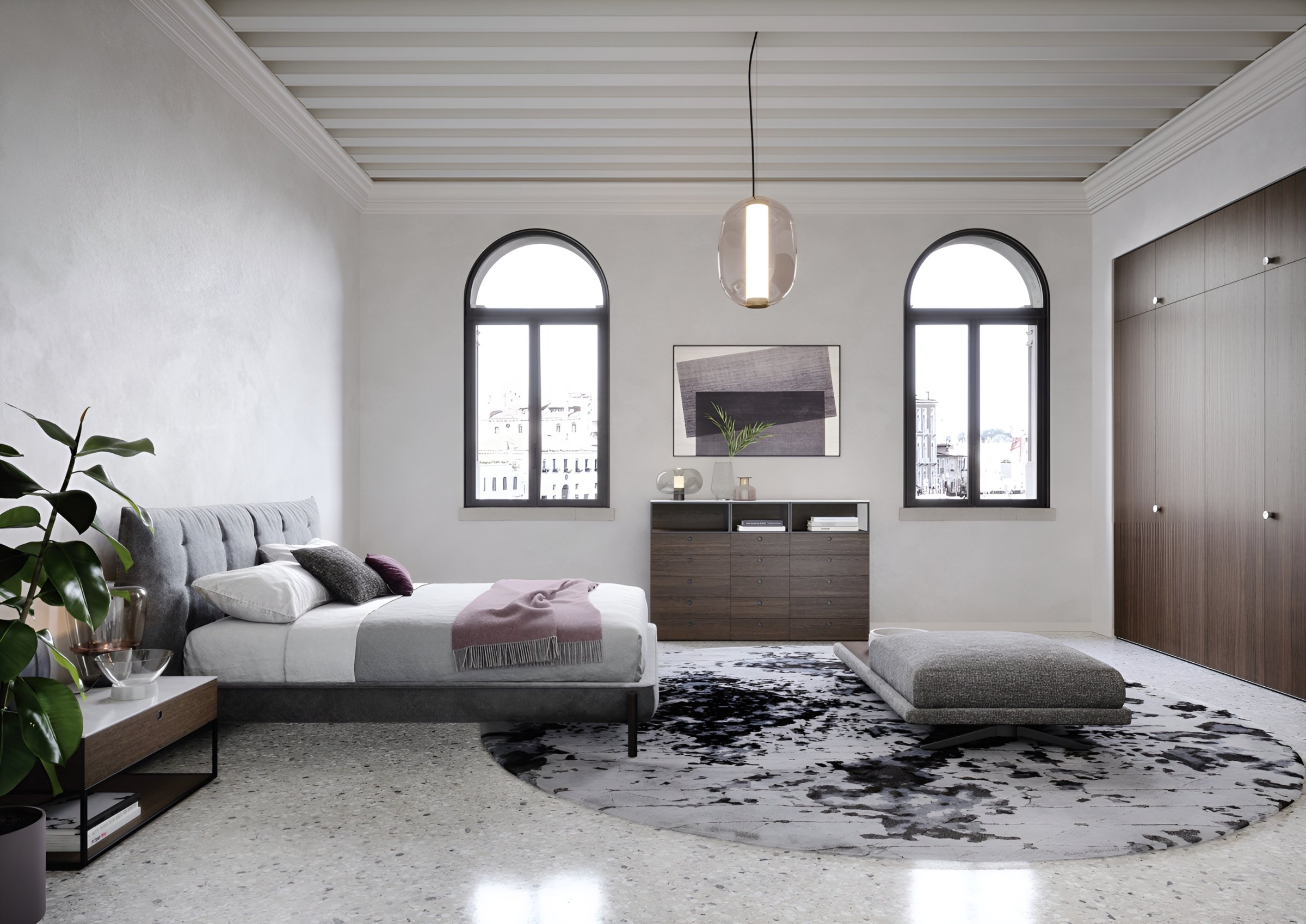 На кровати Tufté, спроектированной Сильвией Преведелло, мягкое изголовье с горизонтальной прострочкой становится ещё мягче, создавая характерный вид «пушистости». Минималистичная, функциональная кровать стоит на деревянных ножках, создавая впечатление, что она парит в комнате.