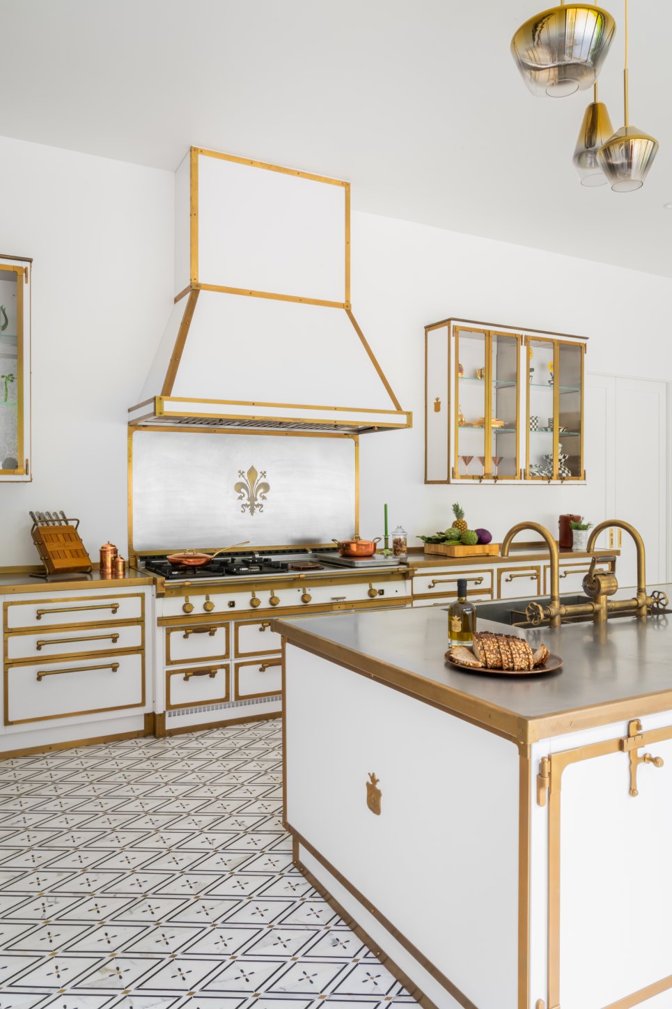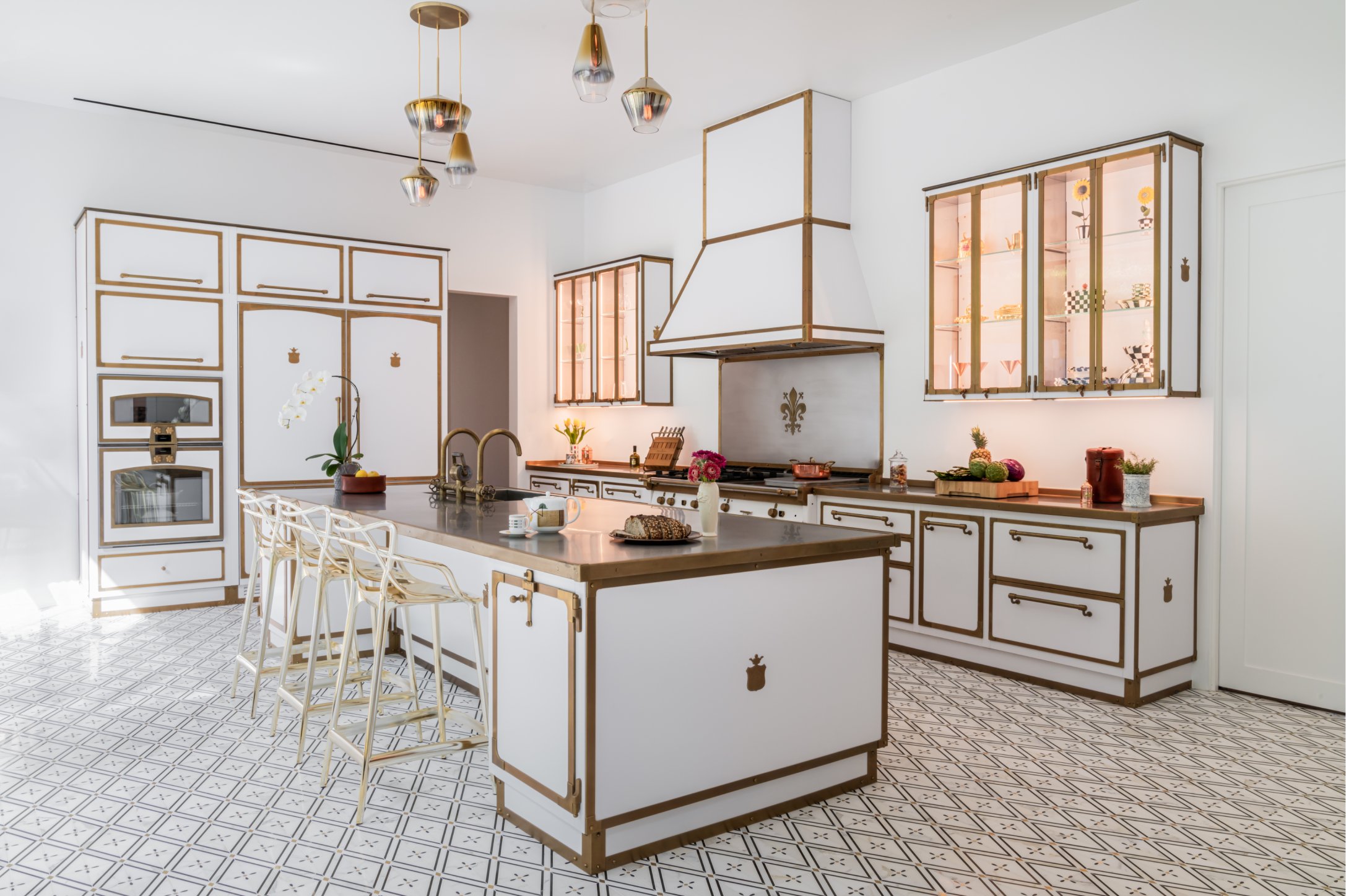 Остров имеет столешницу из нержавеющей стали и врезную раковину с двойным смесителем. Под столешницей находятся посудомоечная машина, выдвижные ящики, шкафы и глубокие ящики. Главная стена отведена под приготовление пищи и оснащена варочной панелью на 8 конфорок, гладкой поверхностью для жарки и вытяжкой. Под варочной панелью находится набор ящиков с деревянными разделителями для столовых приборов, специй, бутылок и посуды. Над ними возвышается панель из матовой стали и вытяжной шкаф в форме пирамиды, по бокам от которых расположены два открытых шкафа с подсветкой и стеклянными полками. На боковой стене расположены холодильник с морозильной камерой, многофункциональная духовка и микроволновая печь, а над ними — отделения для хранения.