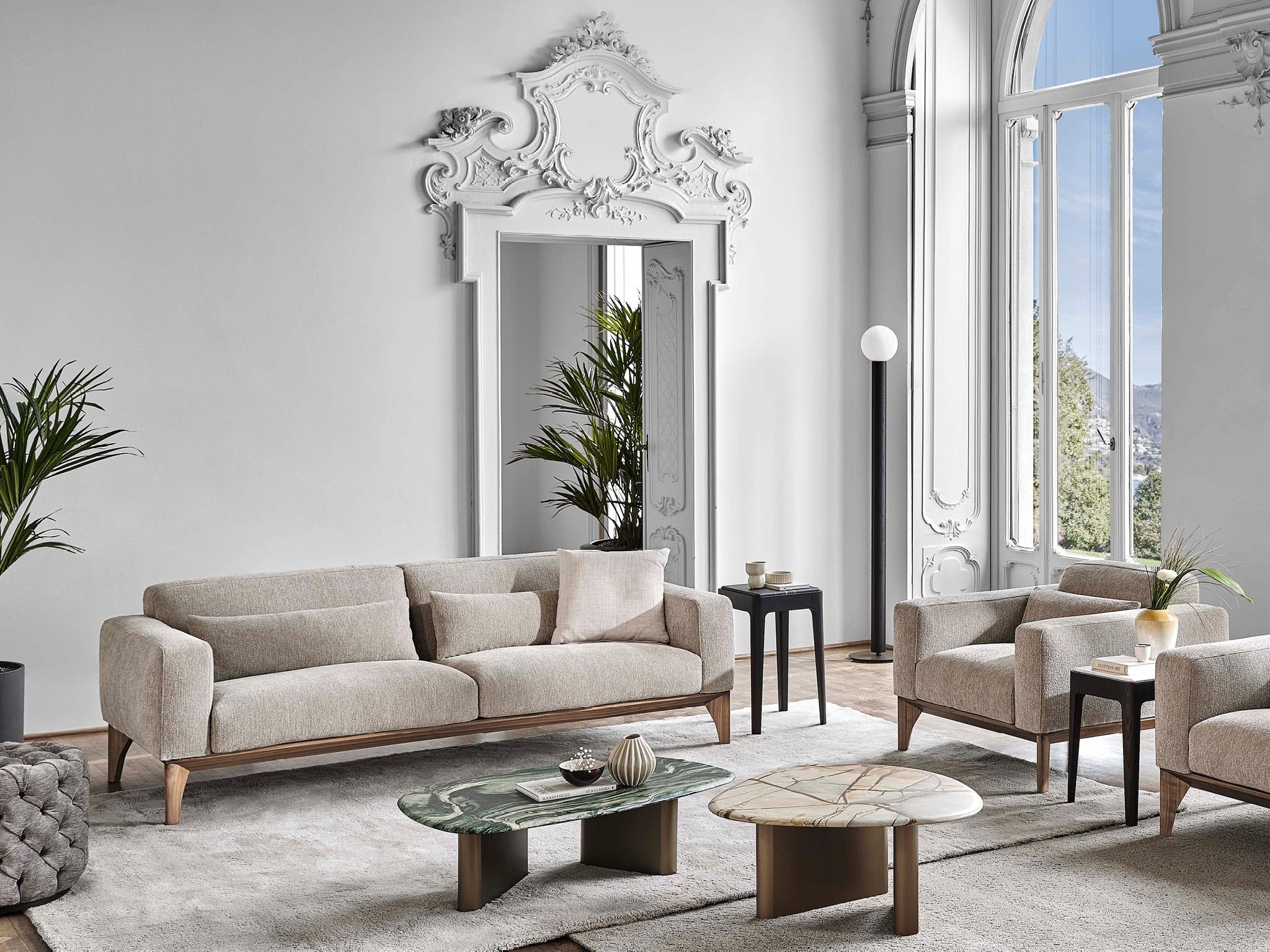 Детали, подчеркивающие тонкий пошив, объединяющий всю коллекцию, — это, несомненно, слегка контрастная рельефная строчка, украшающая края подушек сиденья и спинки, а также подлокотники и мягкую основу.