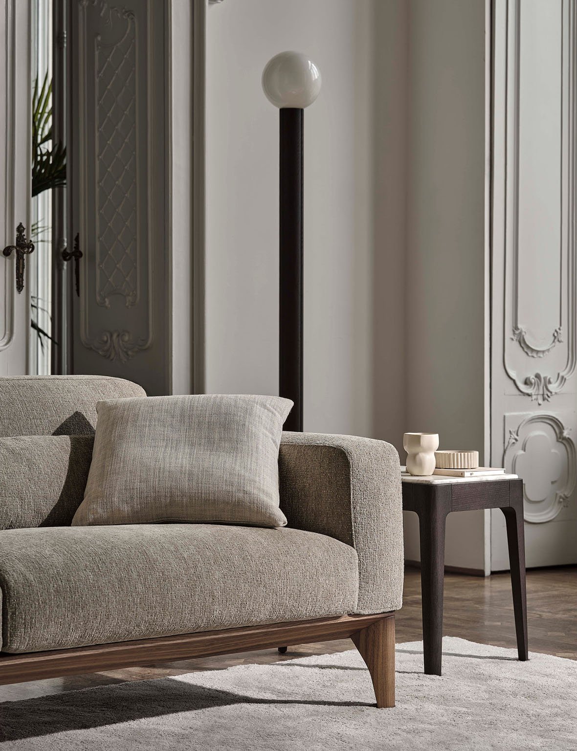 Все элементы имеют одинаковую структуру из орехового массива Canaletta, знакового дерева Porada, и отличаются сдержанными пропорциями и мягкими формами.