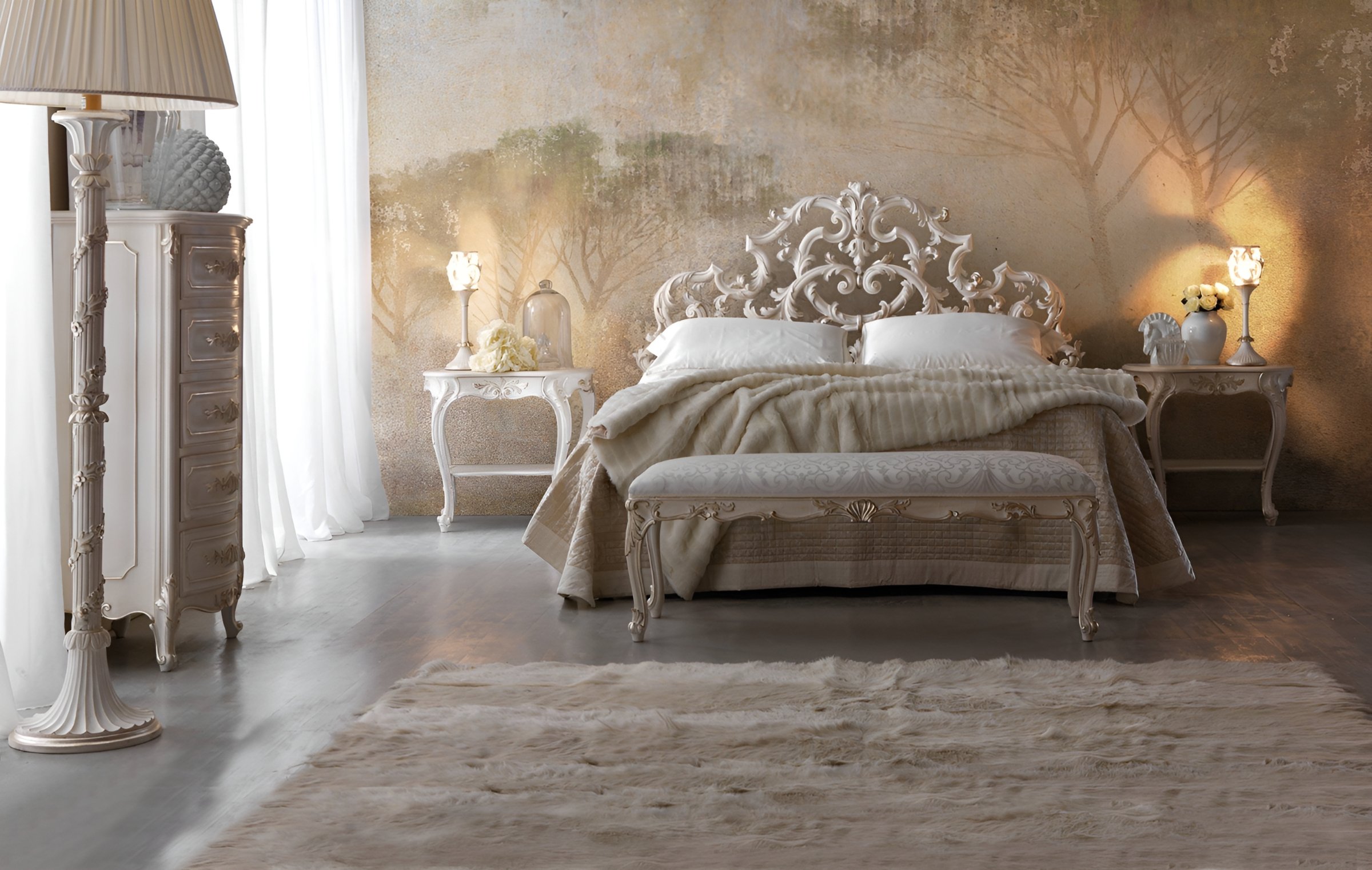 Кровать с ящиком, отделка под старину белым и серебром, класс отделки B.